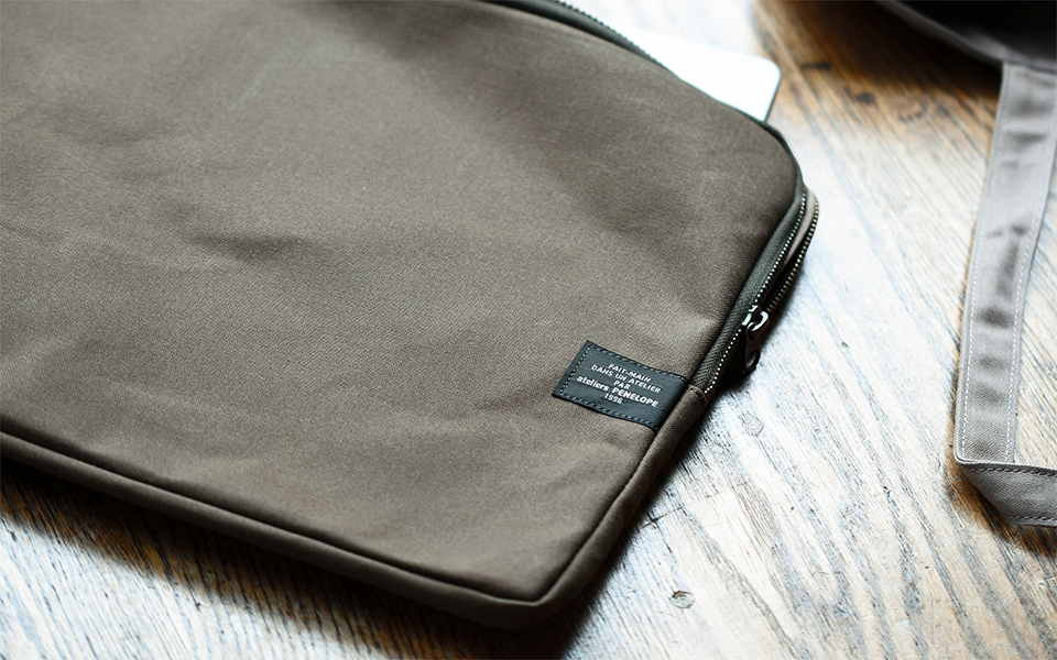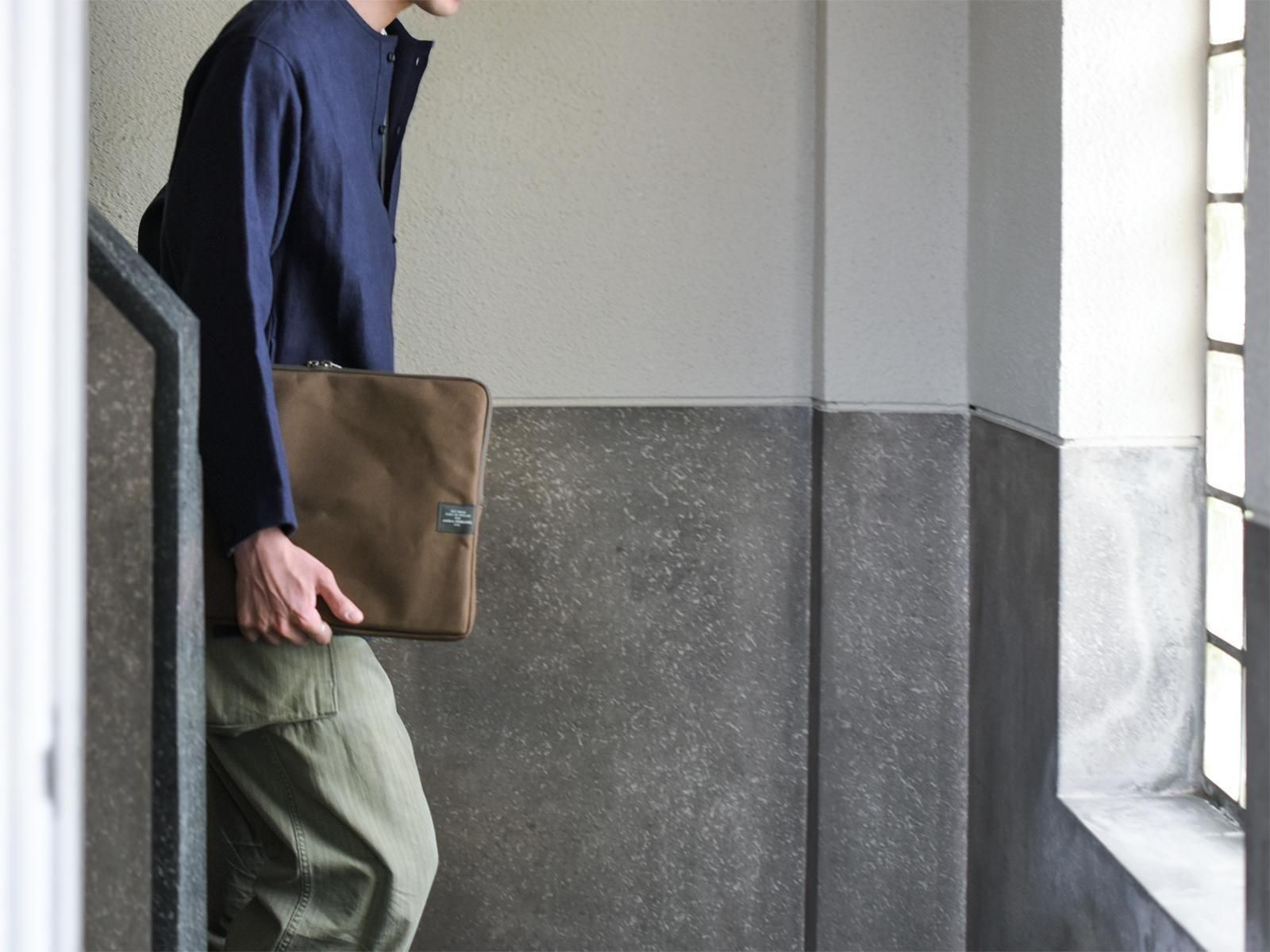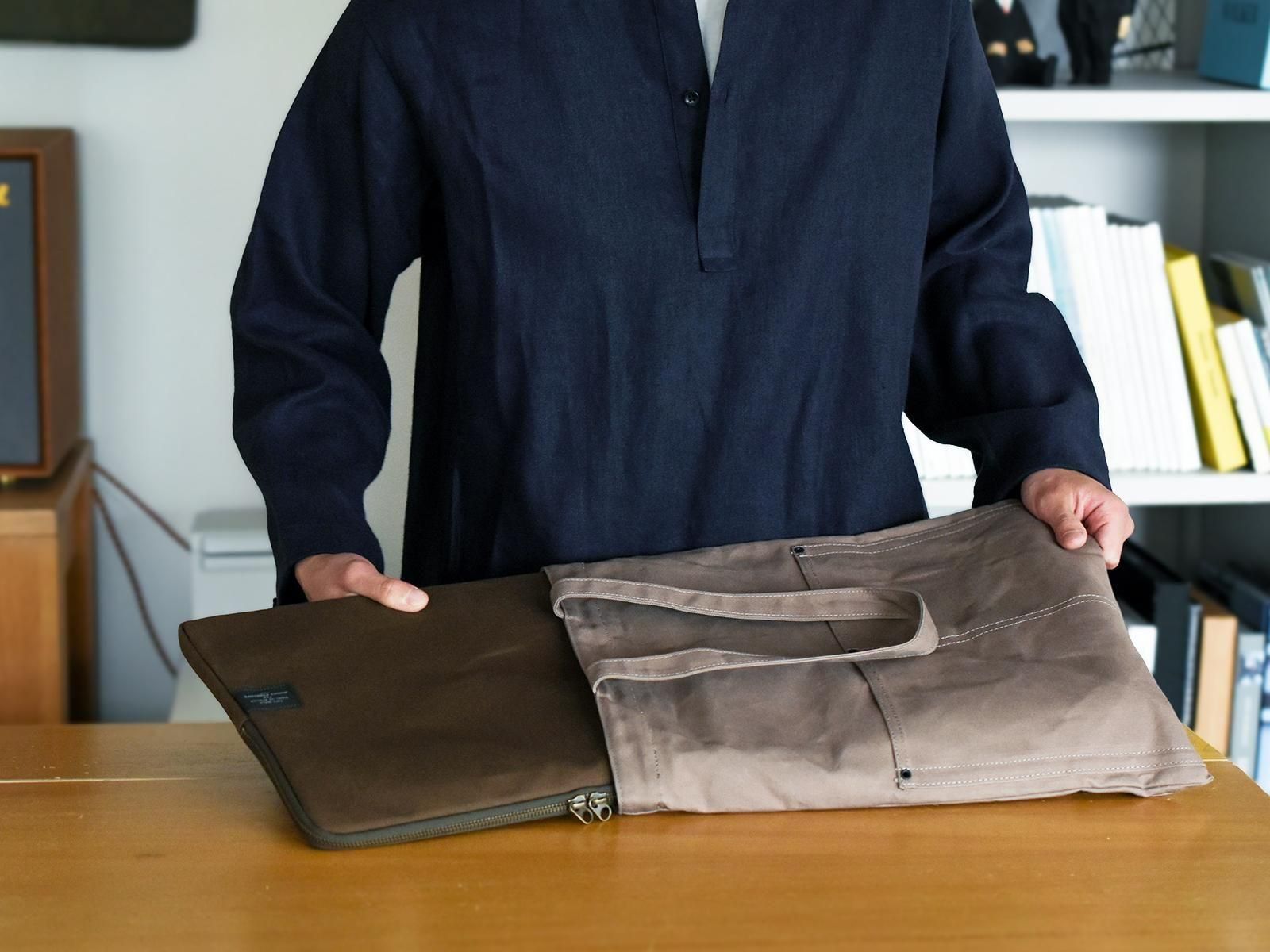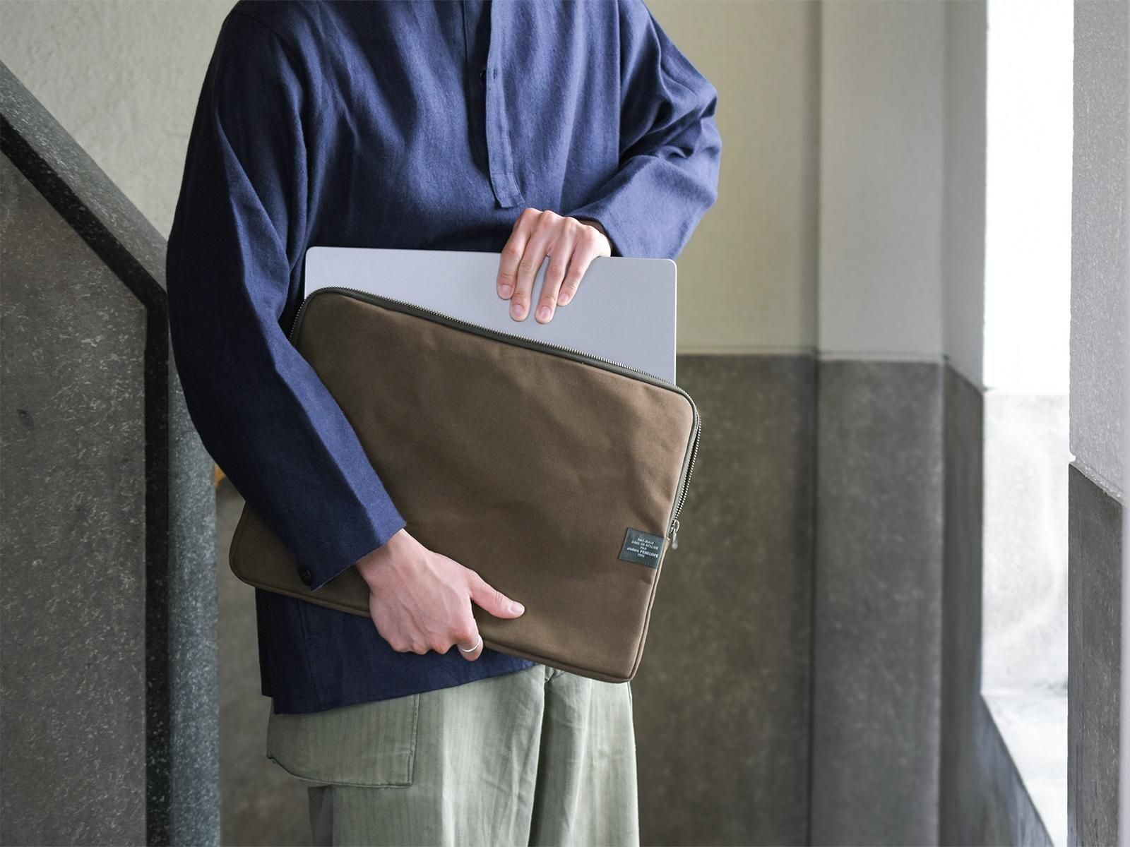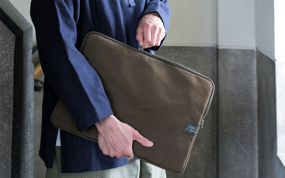 帆布の内側にネル素材を張合わせたボンディング素材を使用しています。 ノートパソコン(MacBook)15インチが納まるケースは 開閉がしやすいダブルファスナーになっています。書類も一緒に収納できるようサイズ感に少しゆとりをもたせています。バッグに入れて持ち運ぶ際に安心なアイテムです