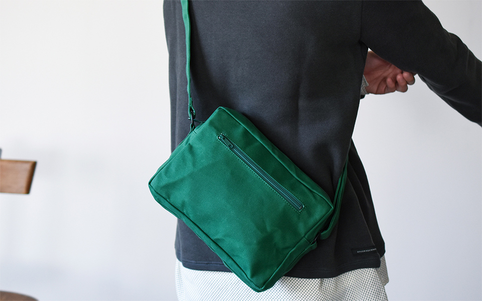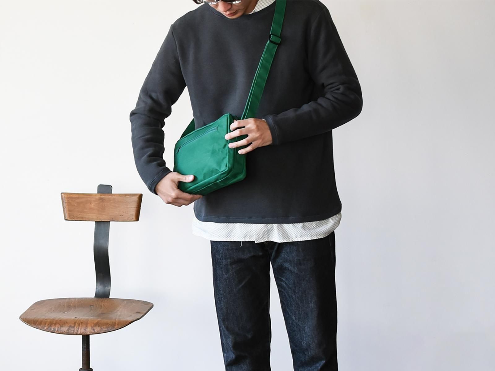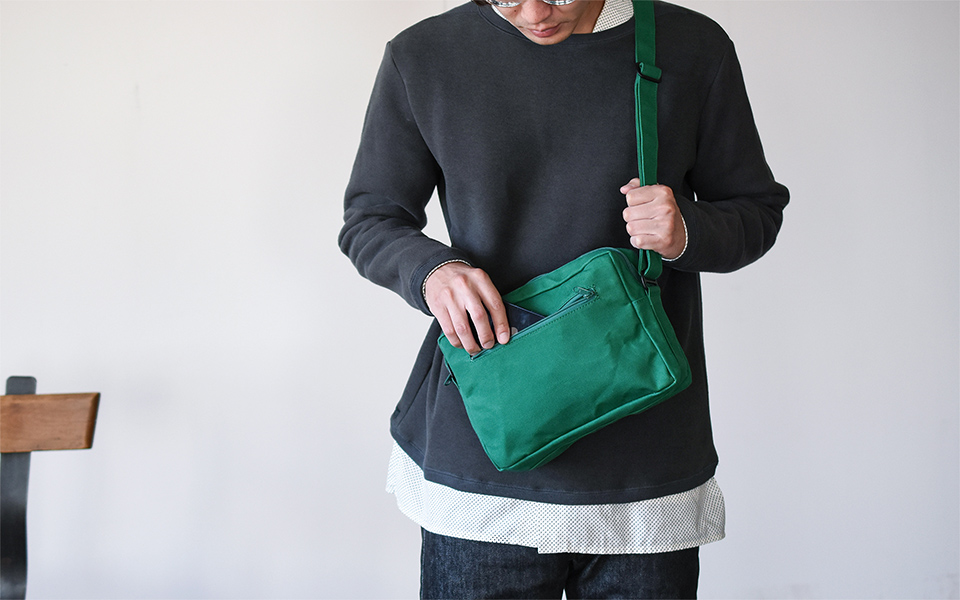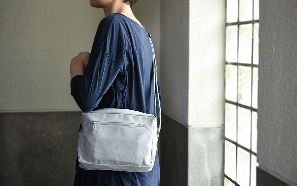 岡山県産10号帆布の生機をオリジナルカラーで媒染したのちにパラフィン(ロウ引き)加工を施しています。パラフィン剤を定着させるための工程を増やすことでより硬さを持つ加工に仕上げました。それによりロウが割れ、皺がヒビのように入ります。これは生地の特徴となります。