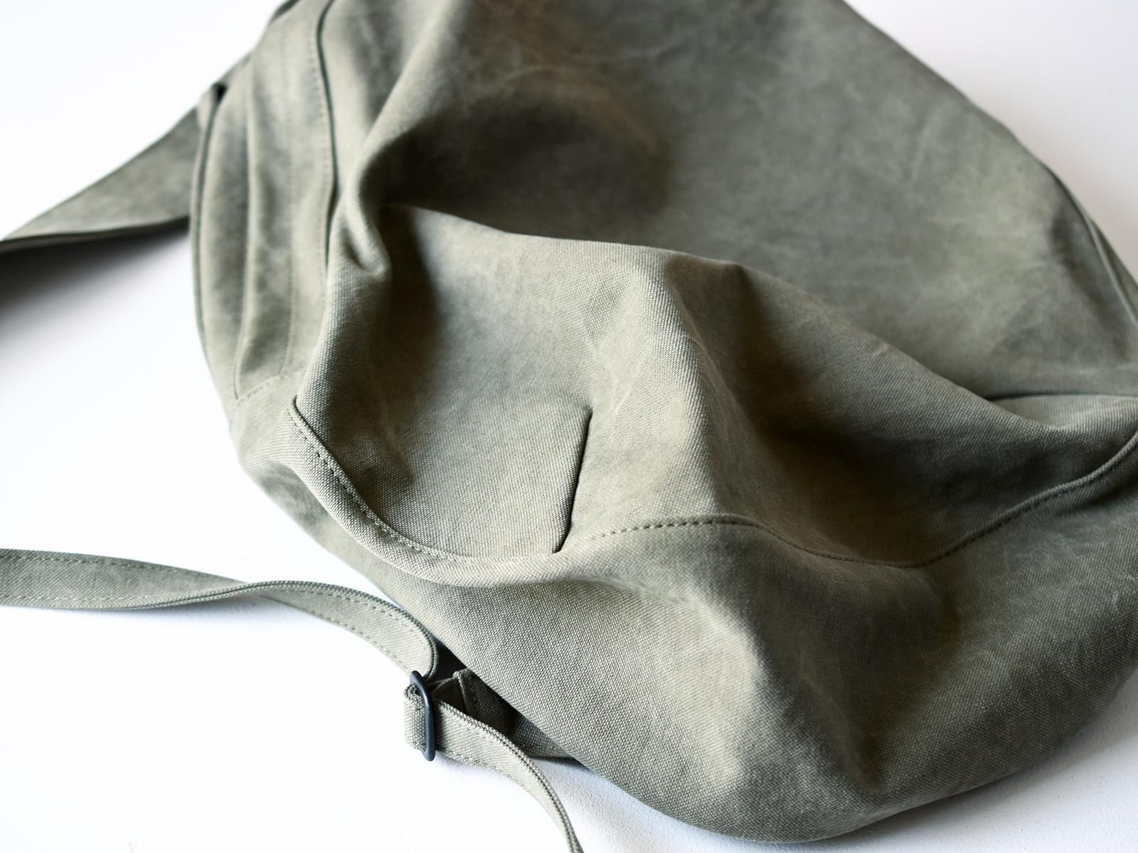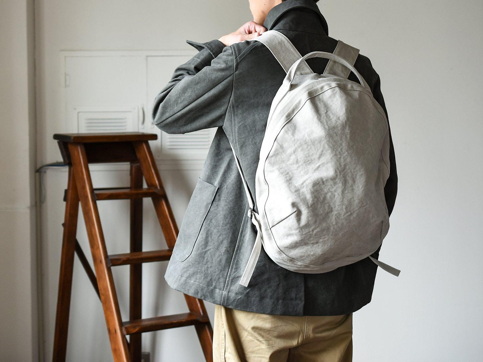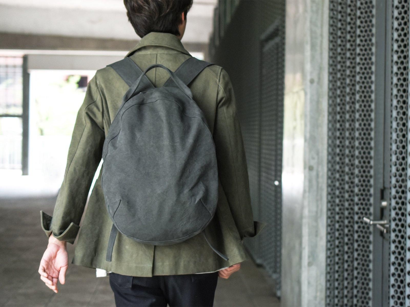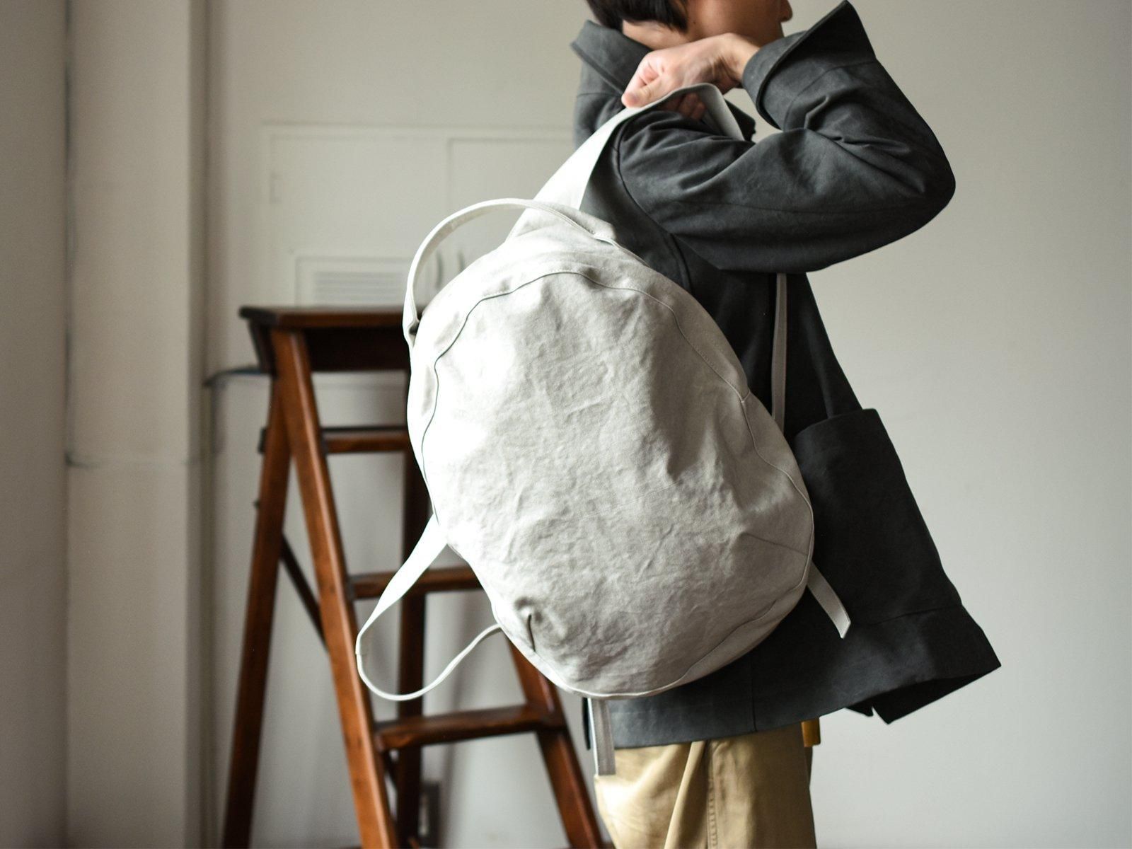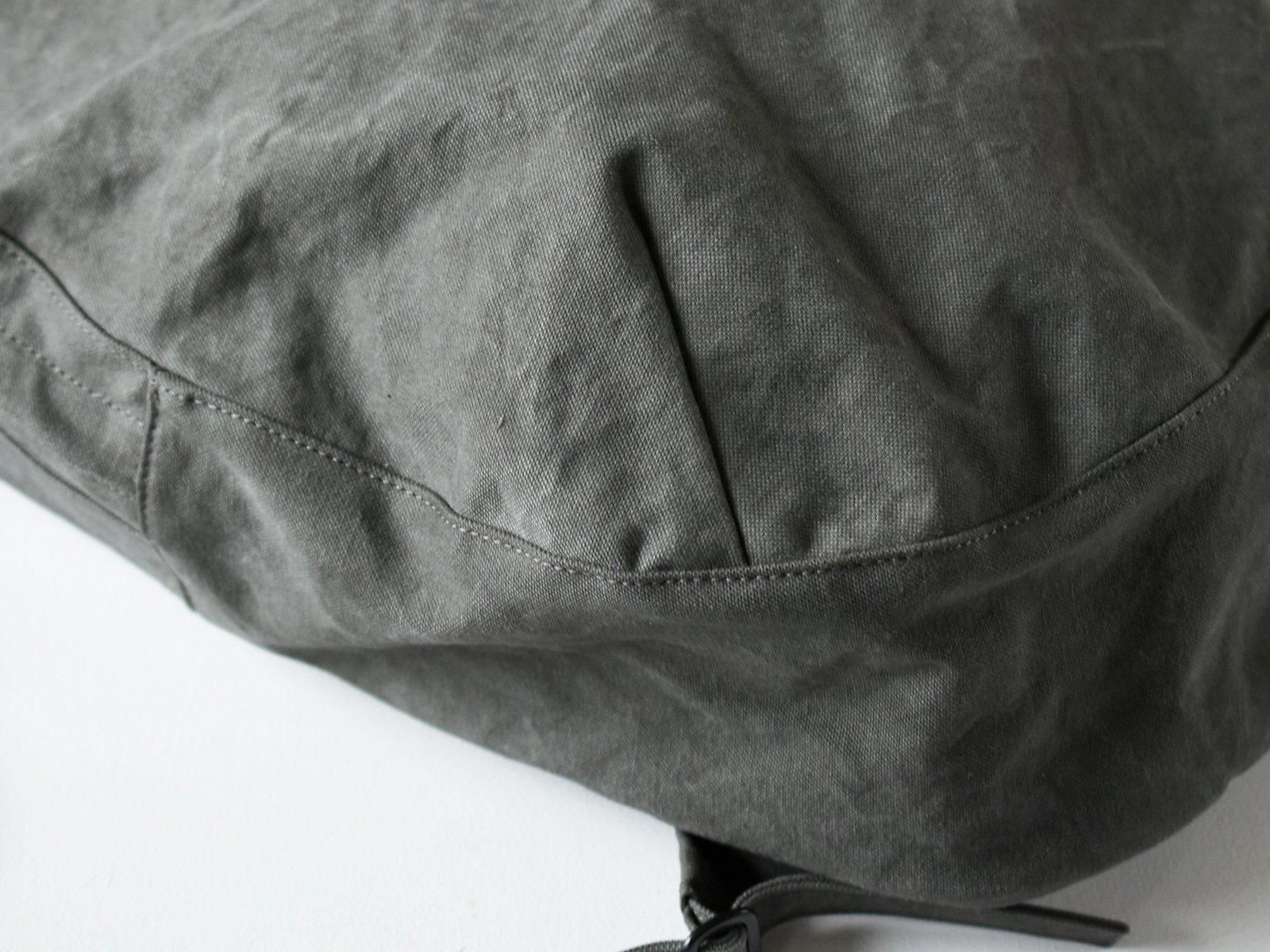 1920年代フランス陸軍のライダーコートの生地から着想を得て生まれた、オリジナルフレンチミリタリーコットン素材を使用したデイパックです。丸みを帯びた繭玉のように見えることからコクーンと名付けました。無駄を削ぎ落としたシンプルなデザインの中にステッチやタックでディテールを加え、素材の風合いを活かした立体感あるフォルムに仕上げました。