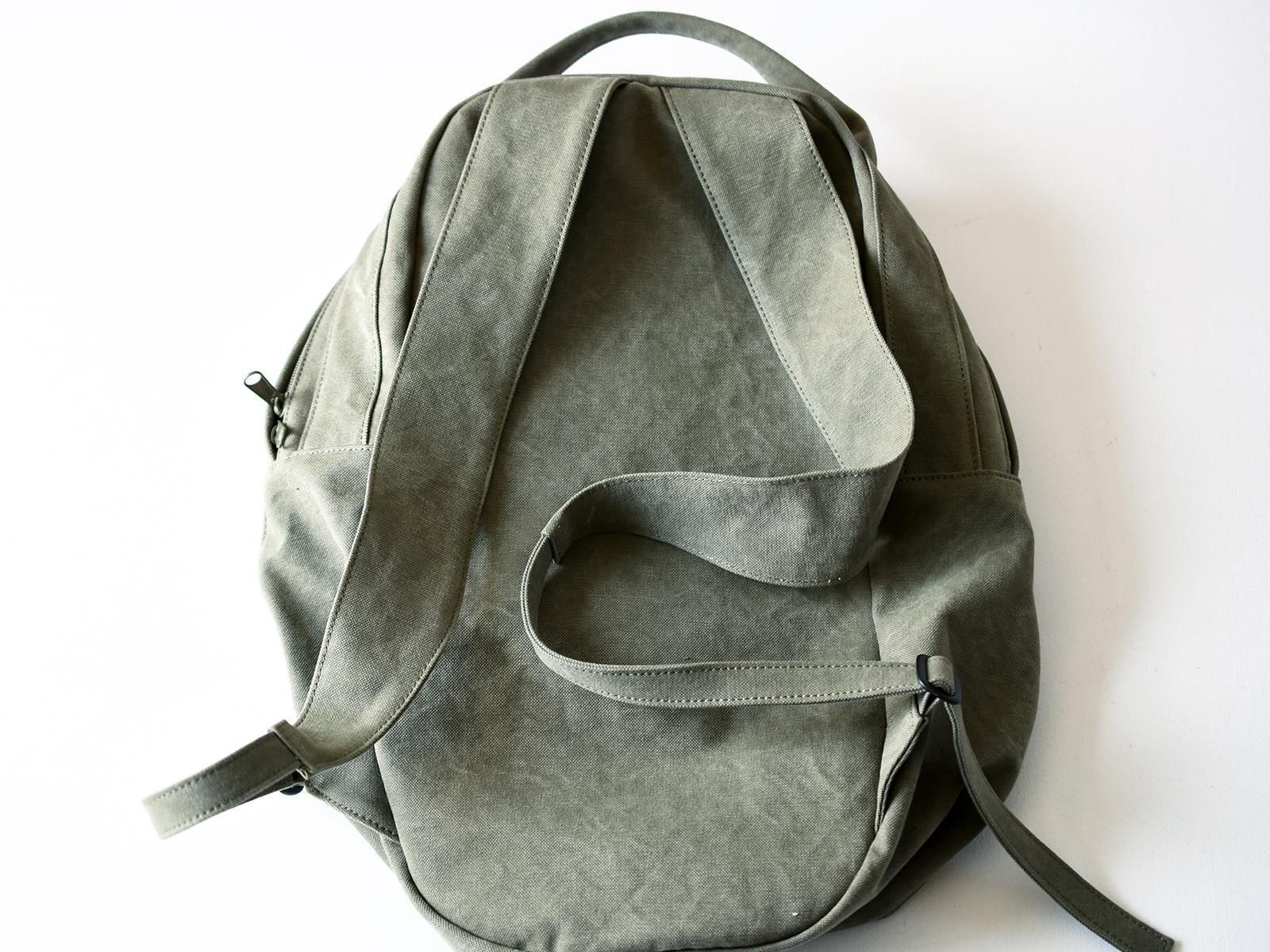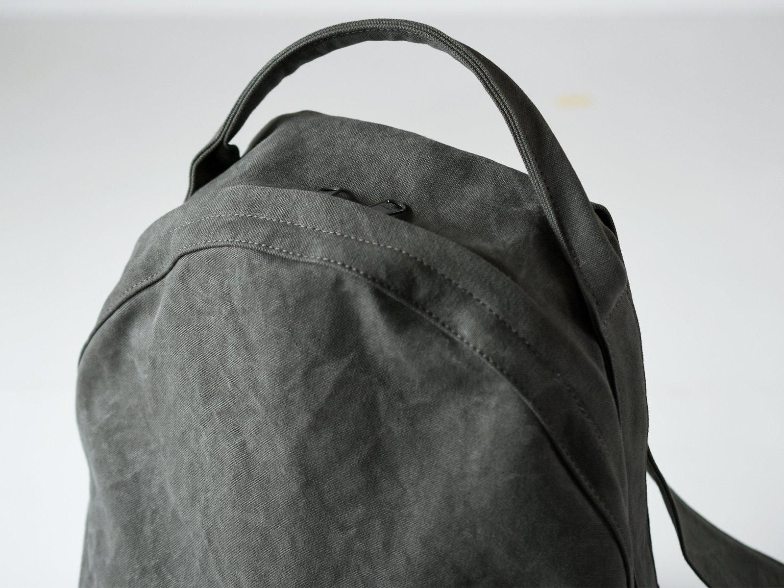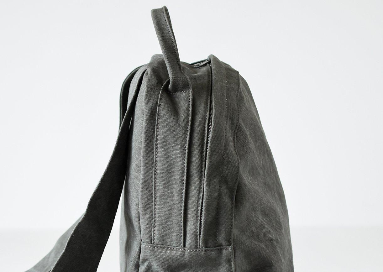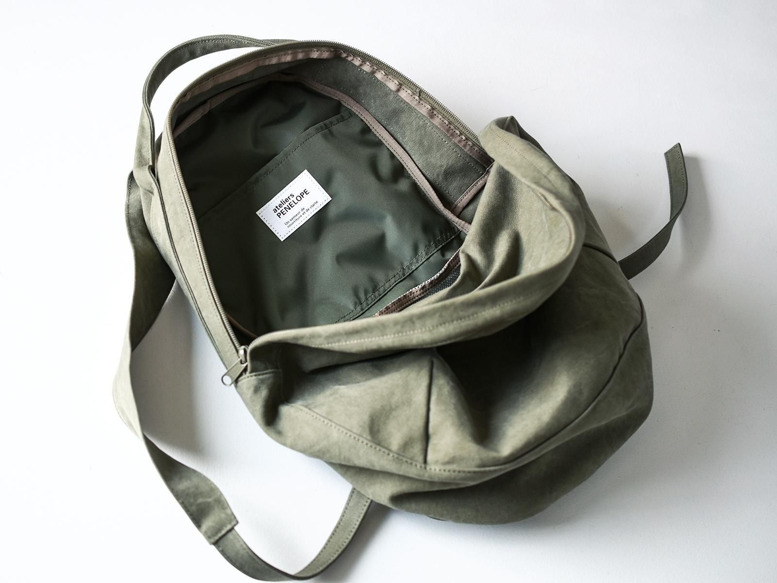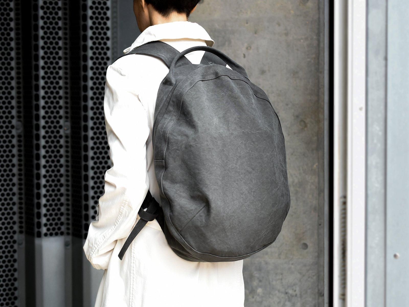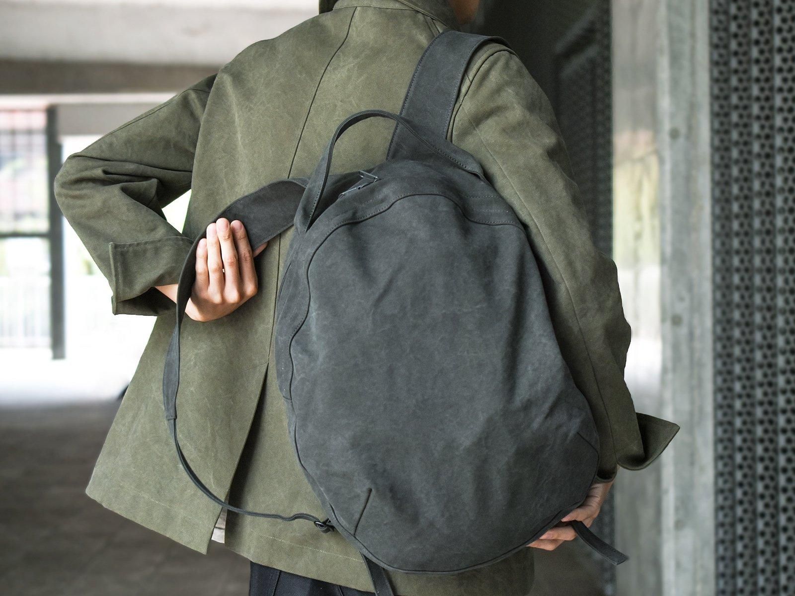 1920年代フランス陸軍のライダーコートの生地から着想を得て生まれた、オリジナルフレンチミリタリーコットン素材を使用したデイパックです。丸みを帯びた繭玉のように見えることからコクーンと名付けました。無駄を削ぎ落としたシンプルなデザインの中にステッチやタックでディテールを加え、素材の風合いを活かした立体感あるフォルムに仕上げました。