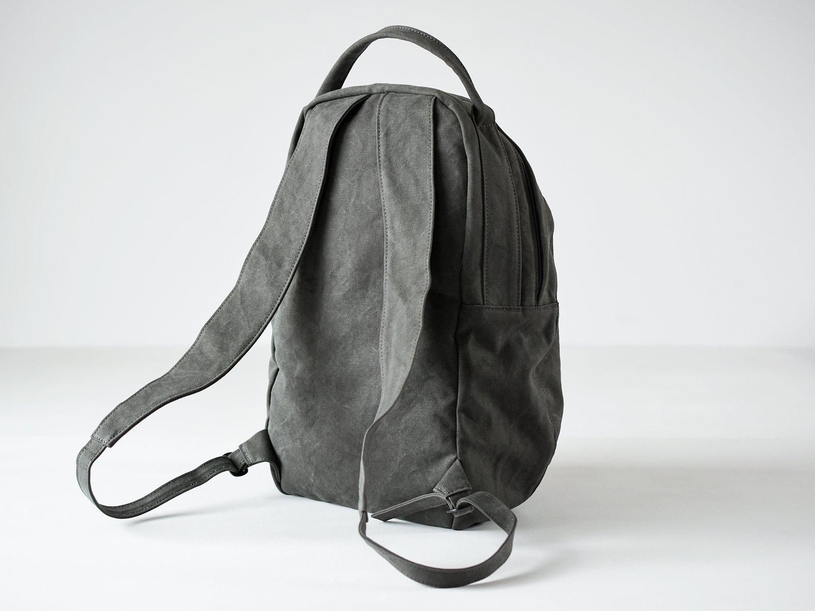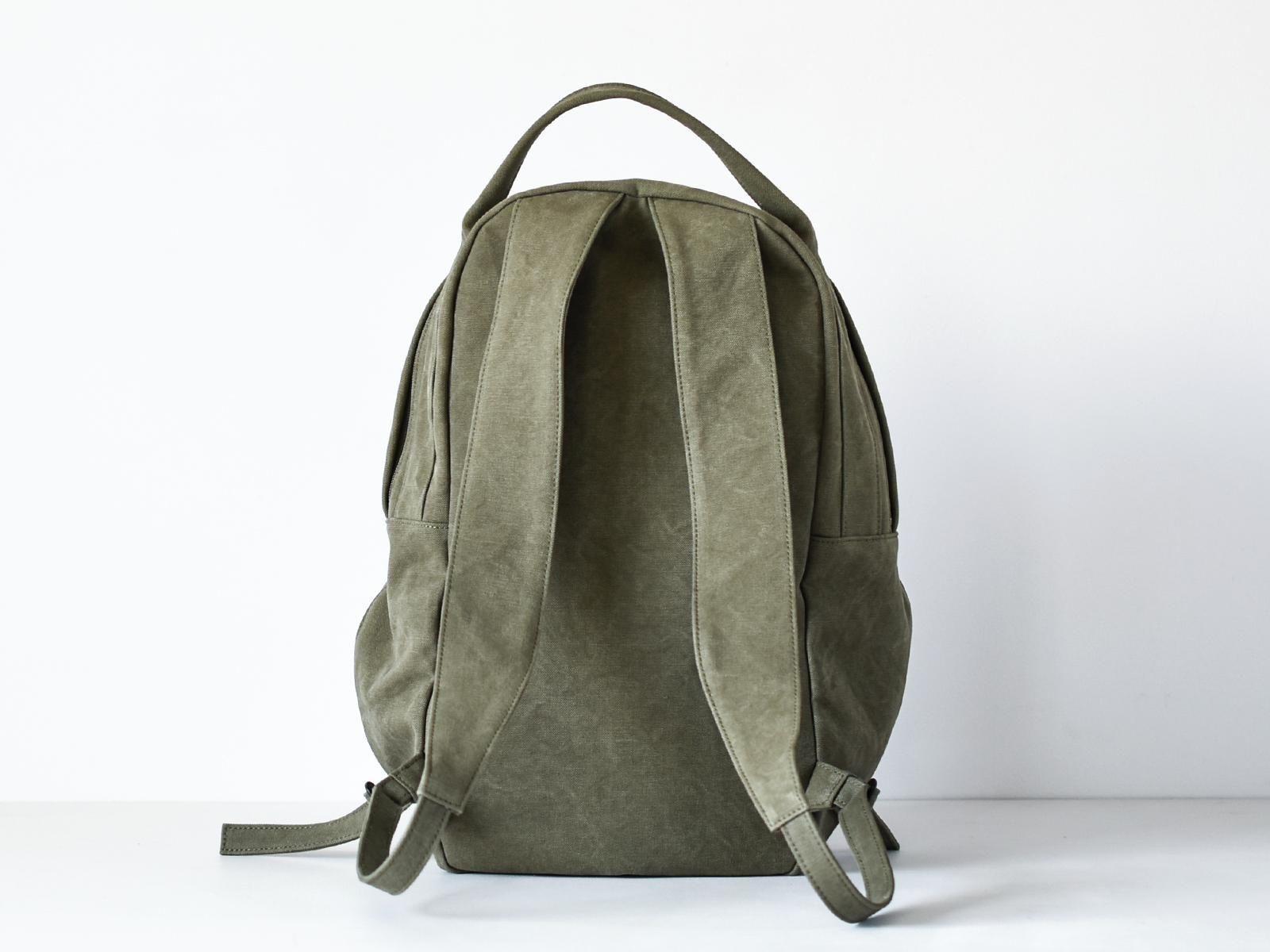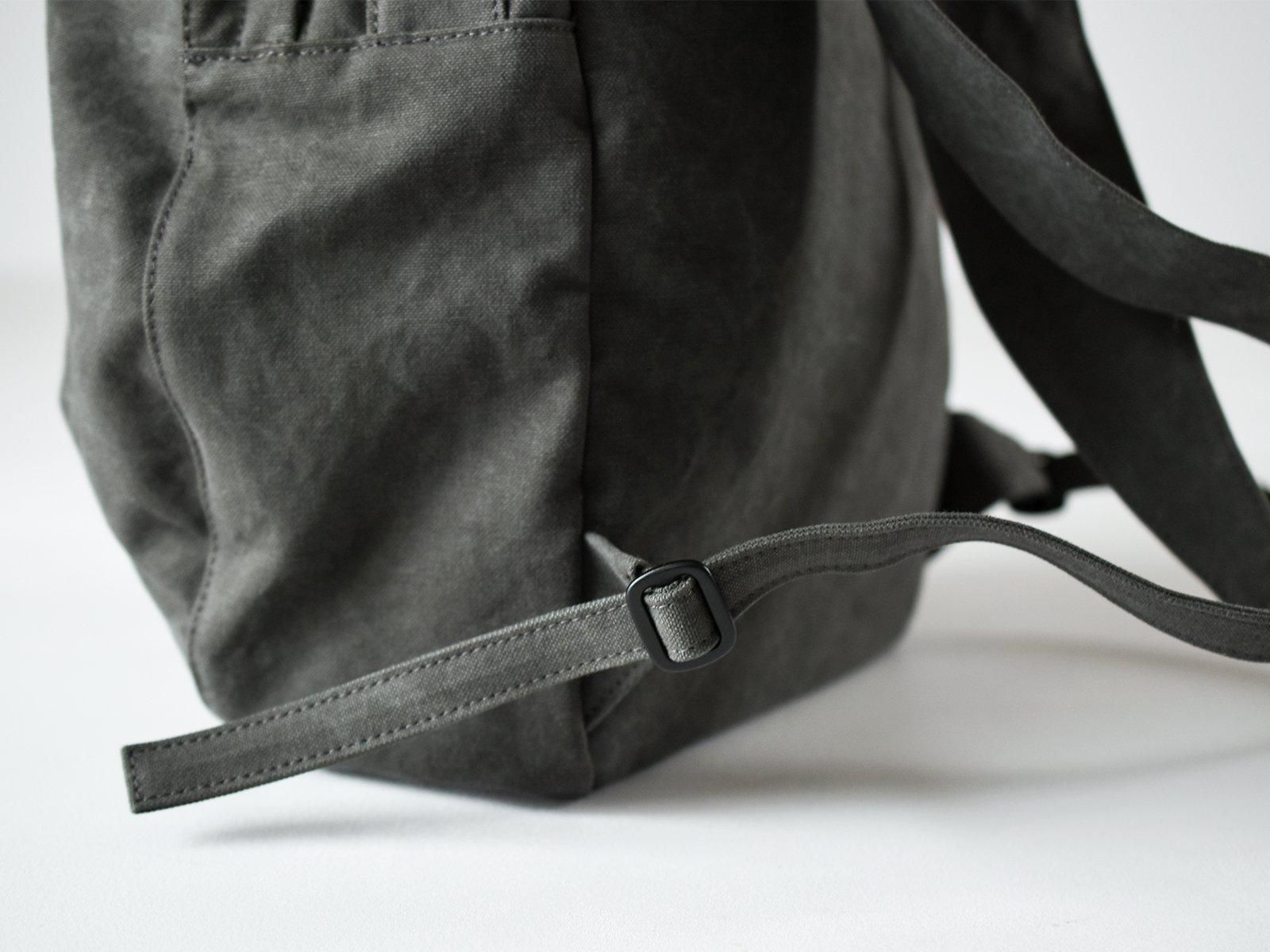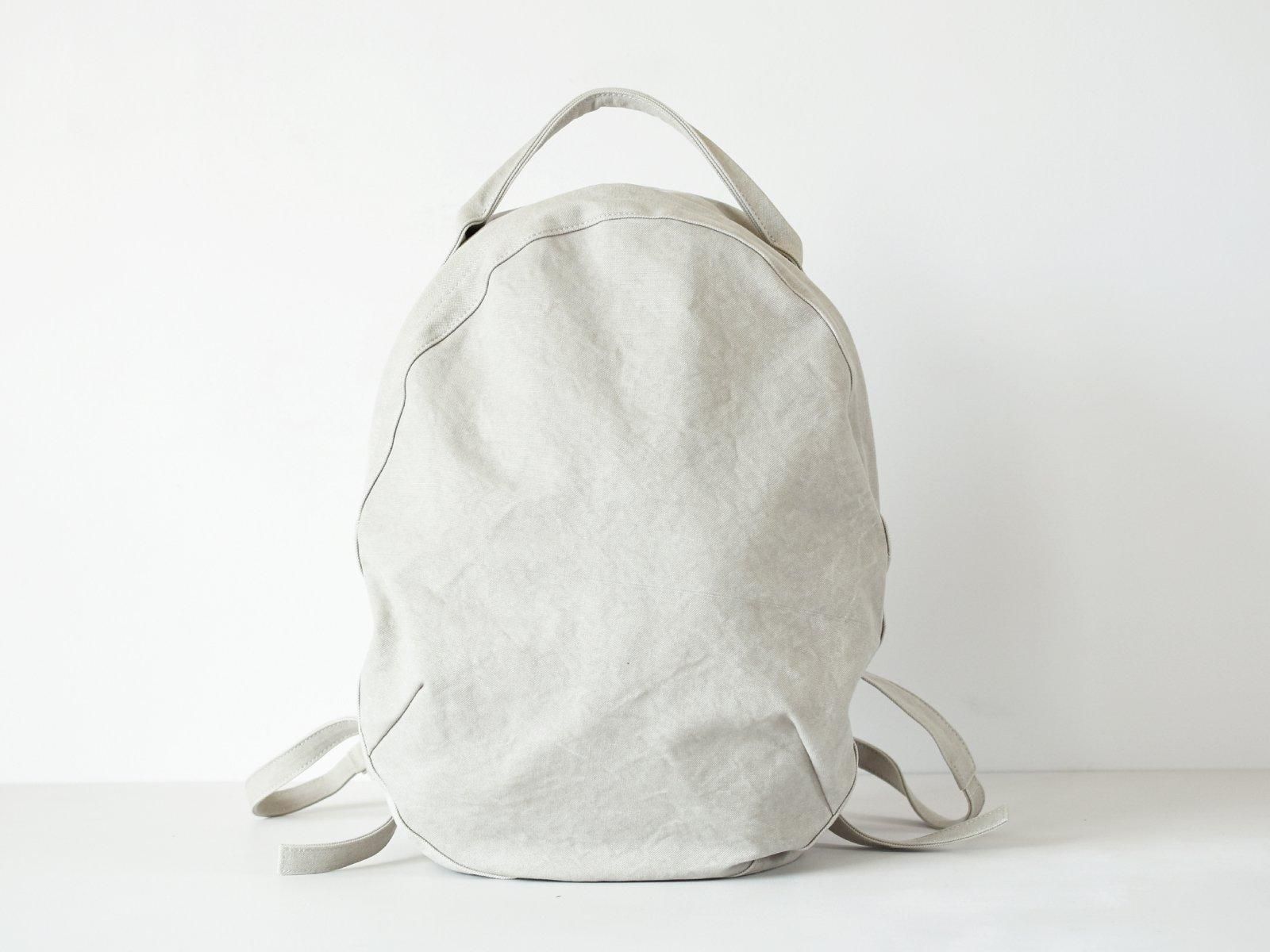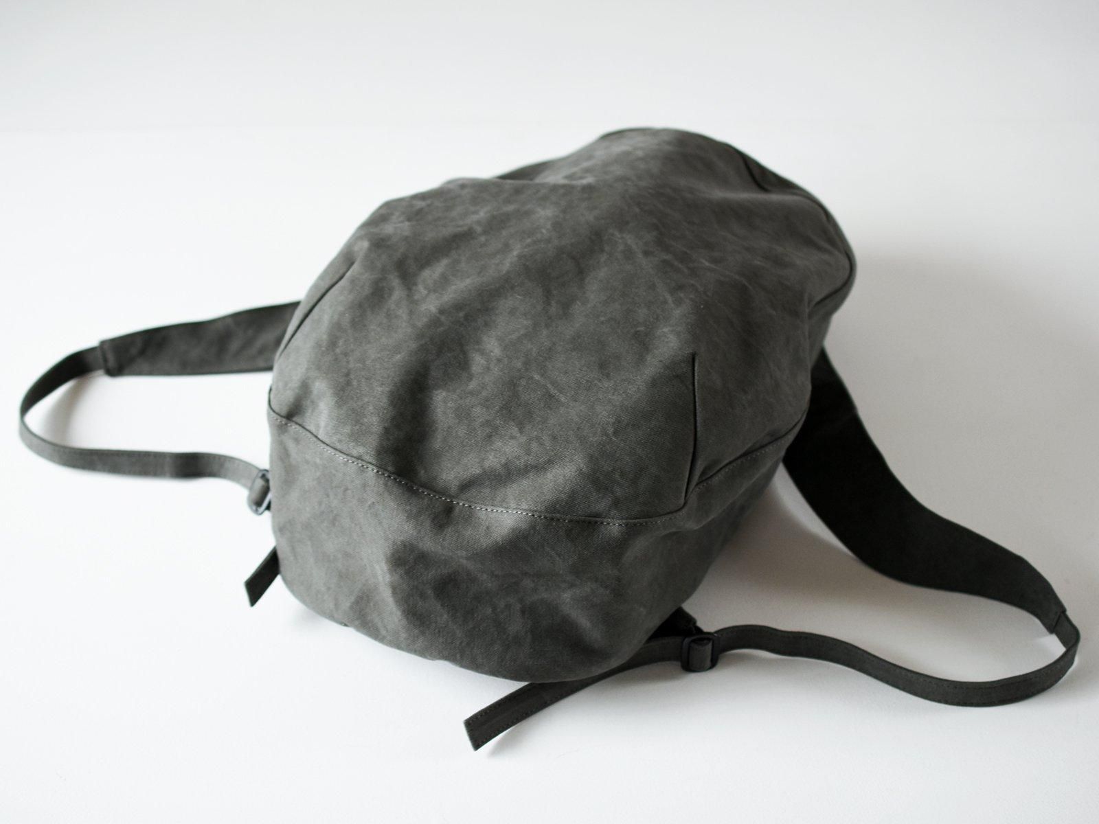 1920年代フランス陸軍のライダーコートの生地から着想を得て生まれた、オリジナルフレンチミリタリーコットン素材を使用したデイパックです。丸みを帯びた繭玉のように見えることからコクーンと名付けました。無駄を削ぎ落としたシンプルなデザインの中にステッチやタックでディテールを加え、素材の風合いを活かした立体感あるフォルムに仕上げました。