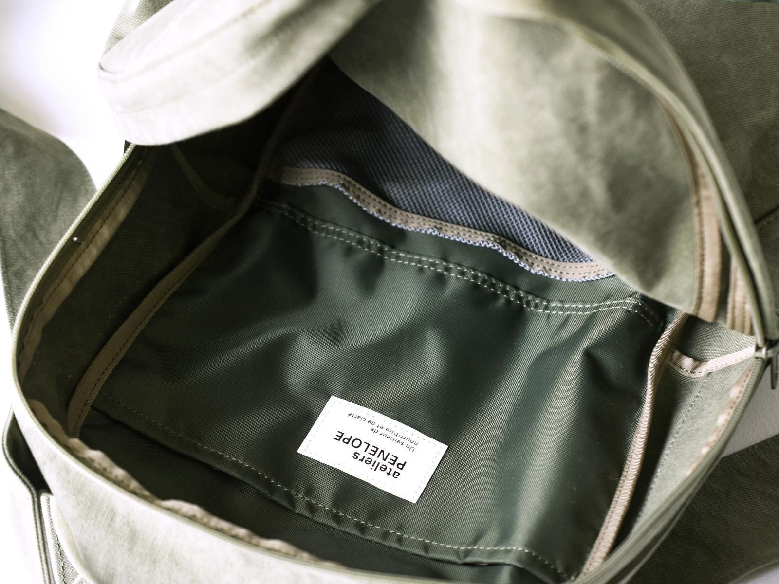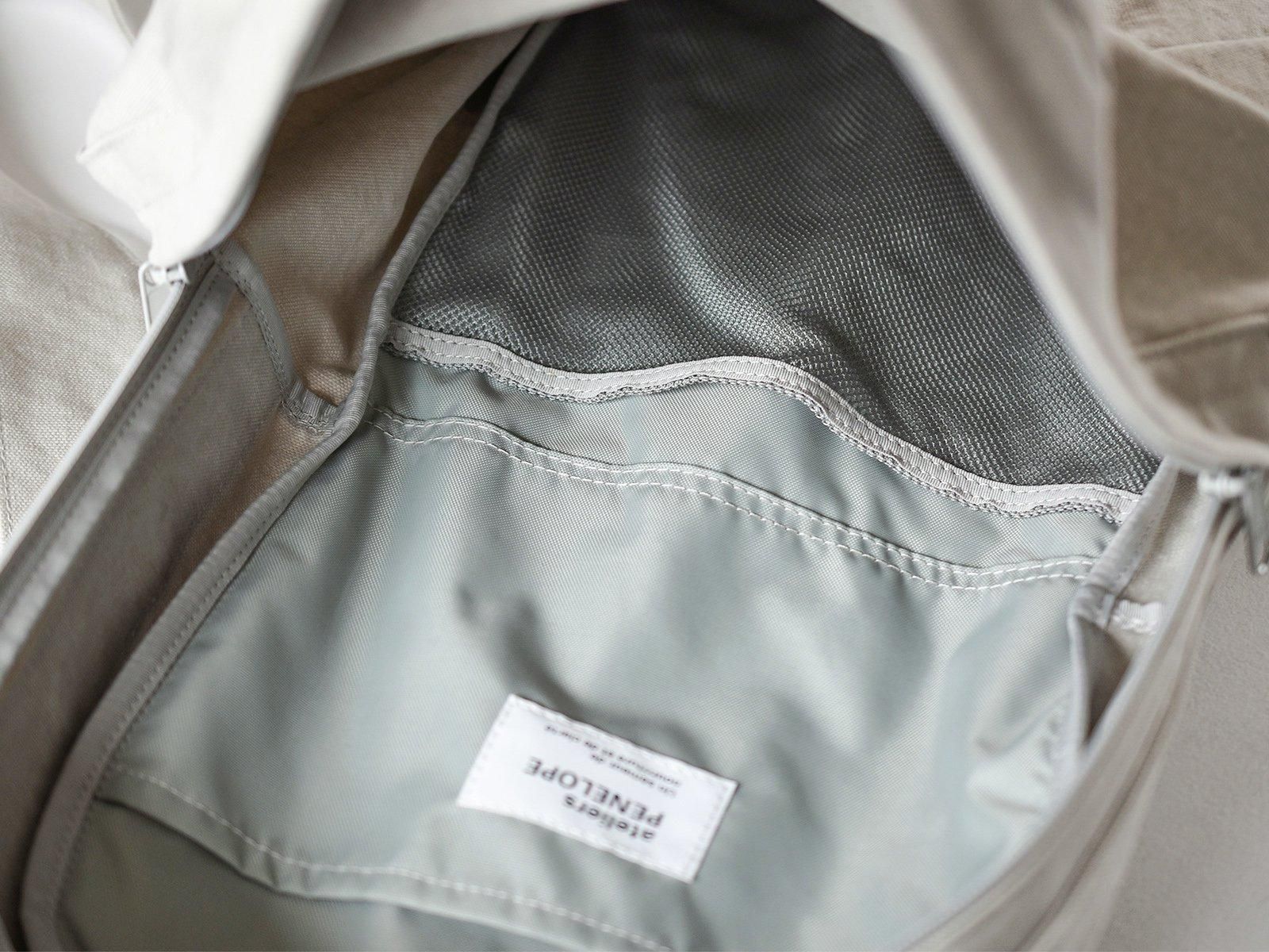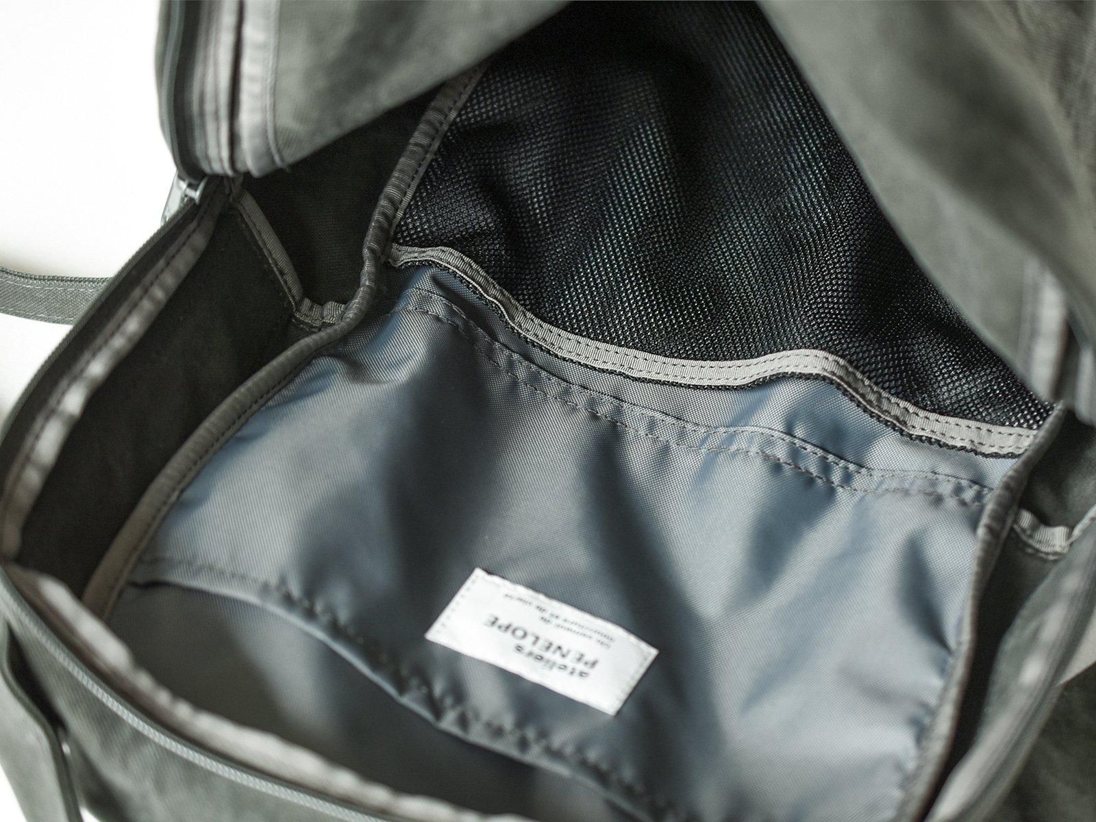 内側背面にはナイロンの裏地と上下に分かれたポケットがついています。下段ポケットは中身が見えやすいメッシュ素材を使用しています。背当て部にはキルト綿を仕込み背負い心地を良くしています。