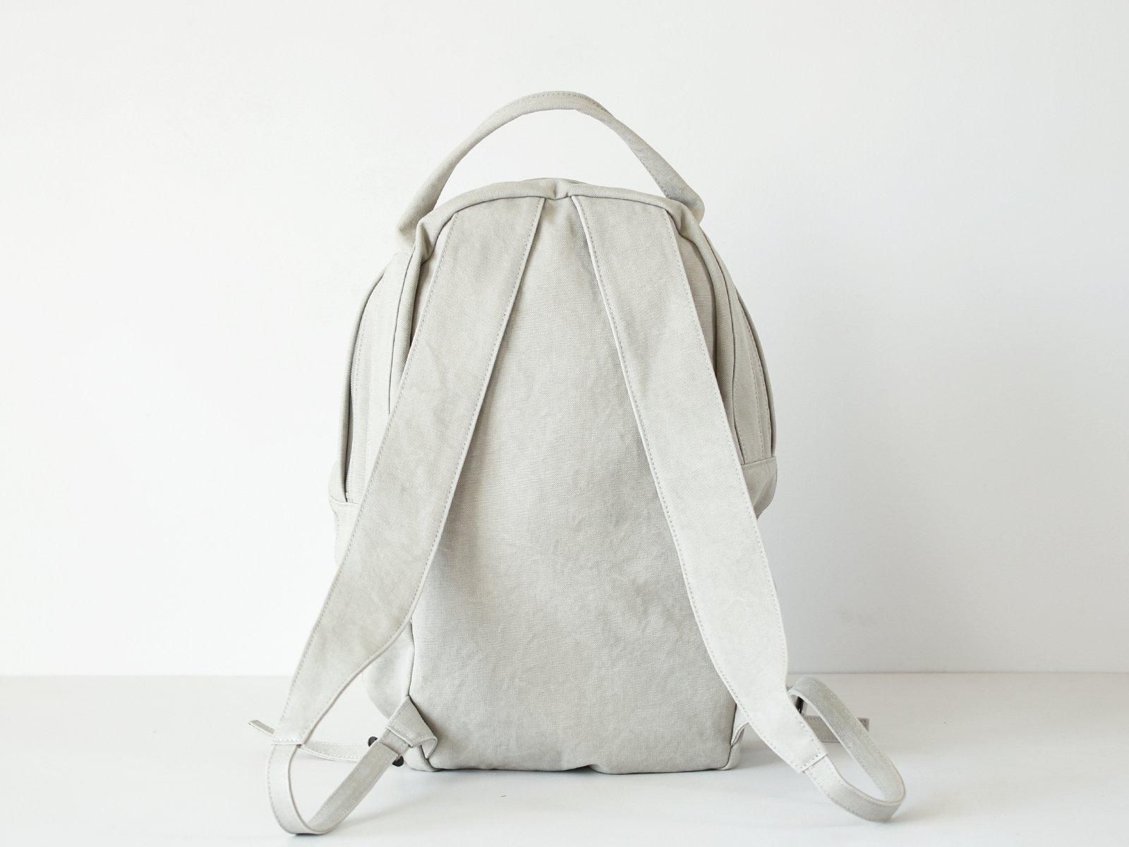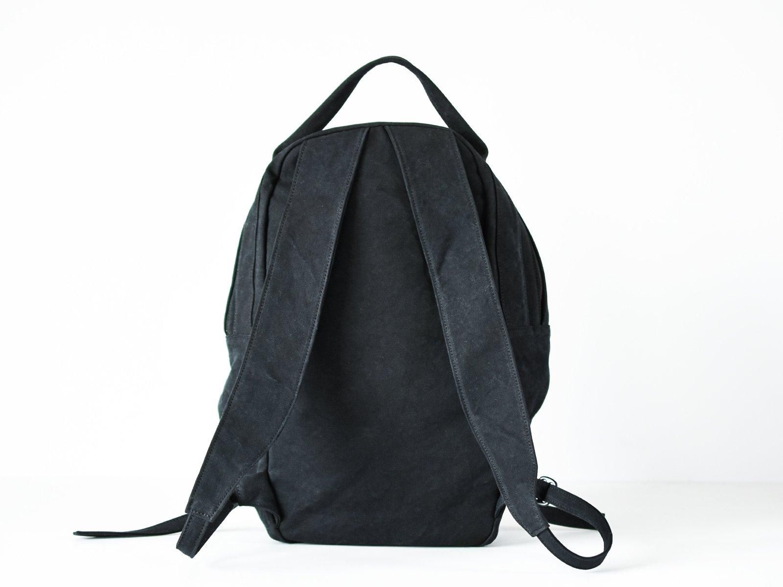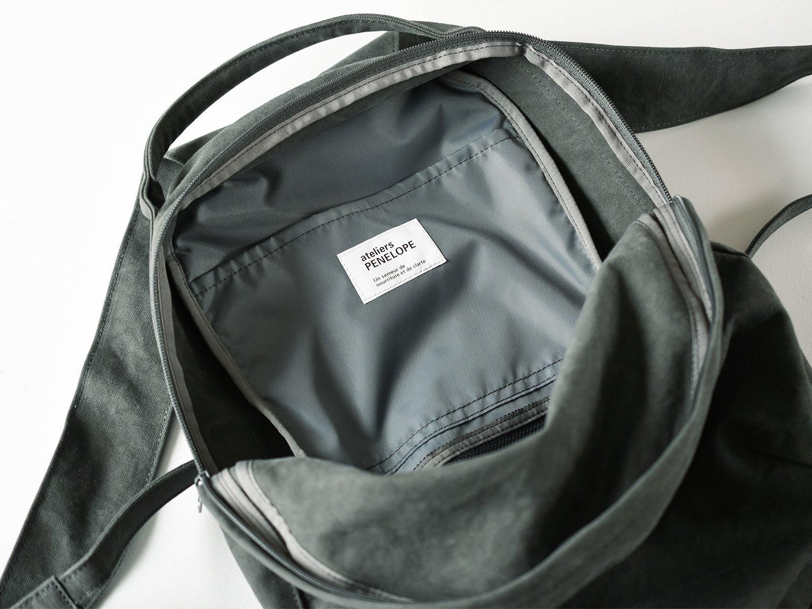 内側背面にはナイロンの裏地と上下に分かれたポケットがついています。下段ポケットは中身が見えやすいメッシュ素材を使用しています。背当て部にはキルト綿を仕込み背負い心地を良くしています。
