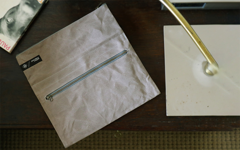 岡山県産10号帆布の生機をオリジナルカラーで媒染したのちにパラフィン(ロウ引き)加工を施しています。パラフィン剤を定着させるための工程を増やすことでより硬さを持つ加工に仕上げました。それによりロウが割れ、皺がヒビのように入ります。これは生地の特徴となります。