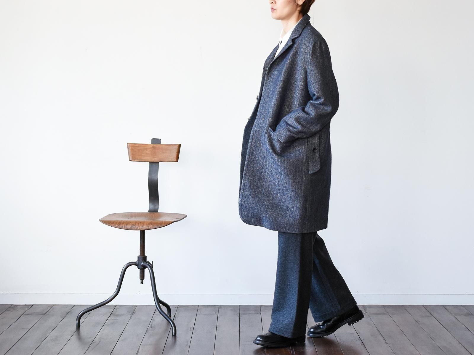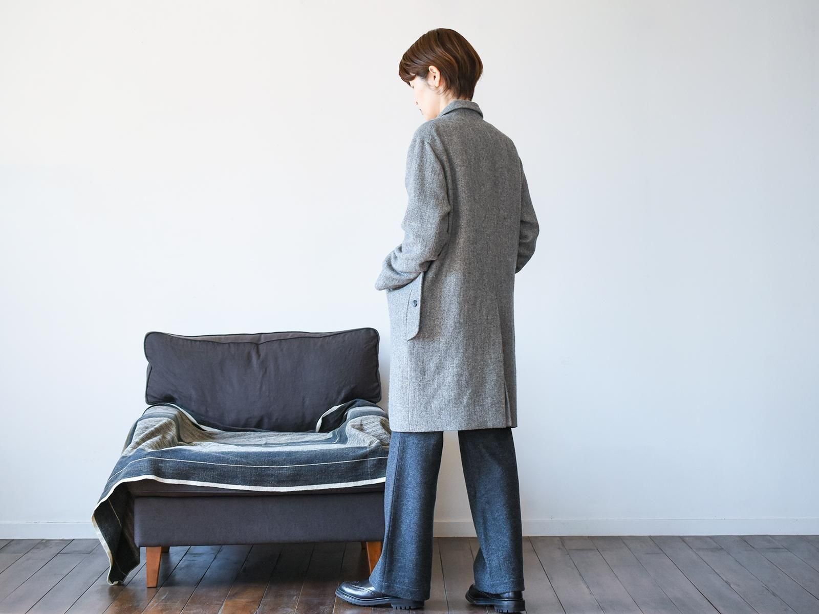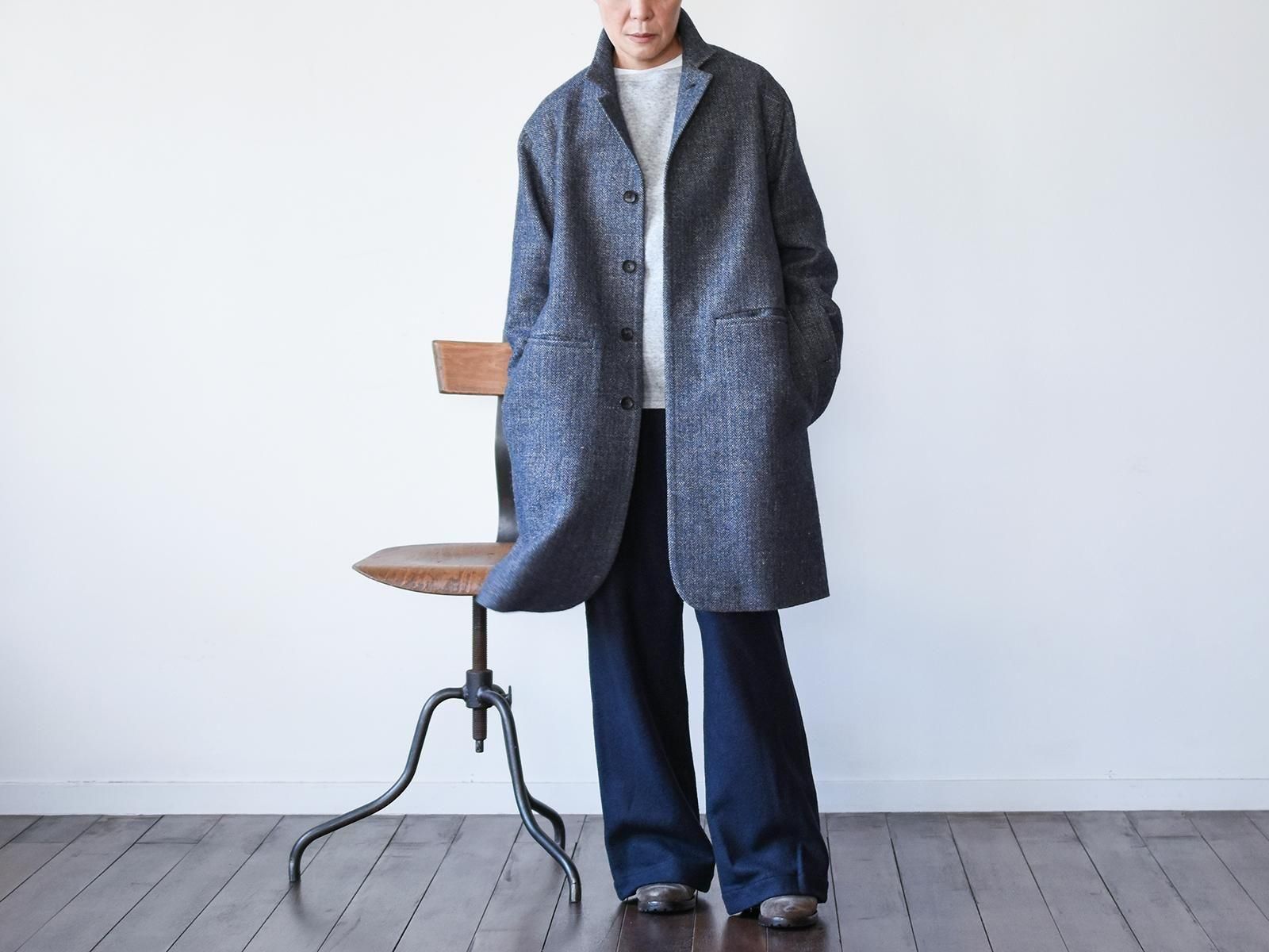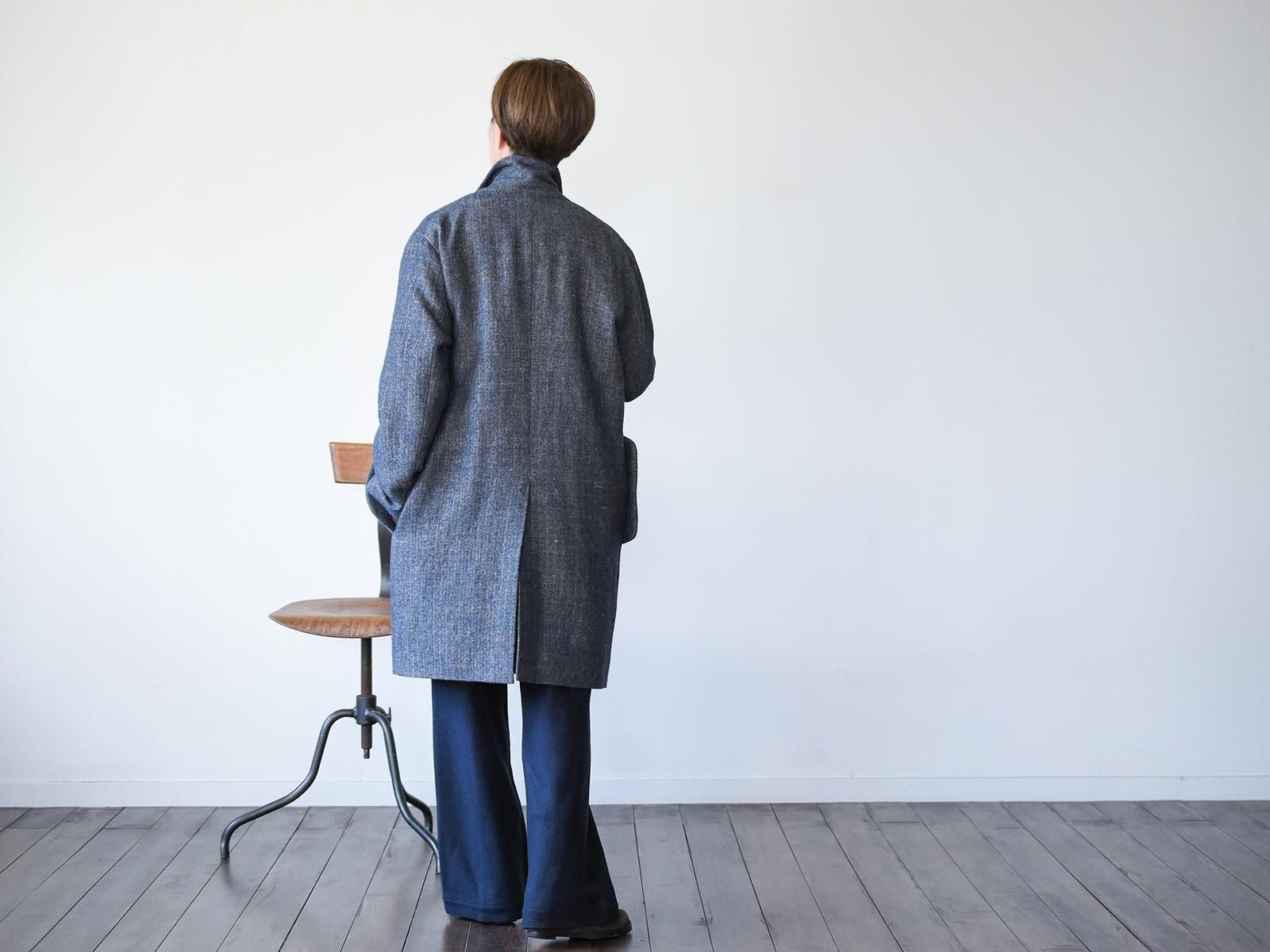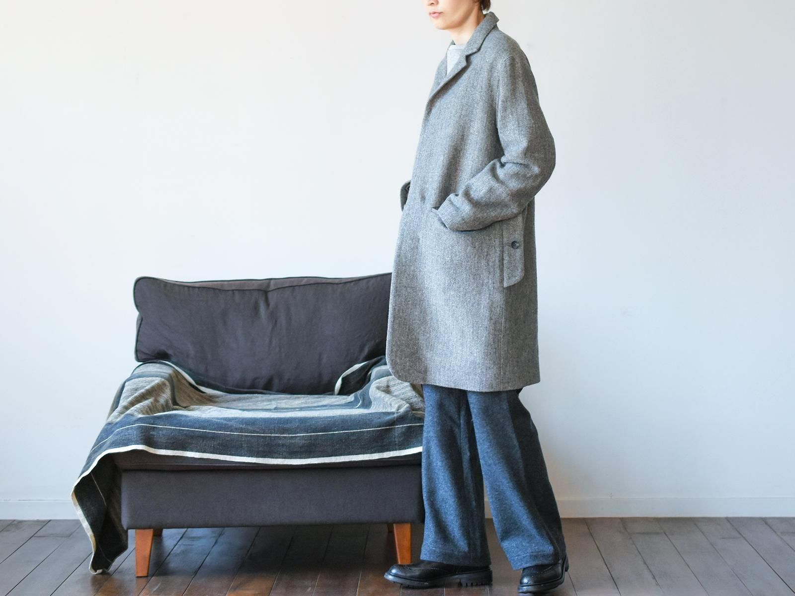 経糸に羊毛を、緯糸にリネンを使用し贅沢に織り上げた上質なヘリンボーン織の国産素材を使用しています。裏地にはフランス製のキュプラガルゼを使用したこだわりの詰まったコートです。小さめのテーラードカラーでメンズライクな中にも女性的でエレガントな要素を加えています。正面に大きめの玉縁ポケット、脇にフラップポケットとWポケット仕様はデザインのアクセントとしても実用としても楽しんでいただけます。センターバックにはスリットが入っています。