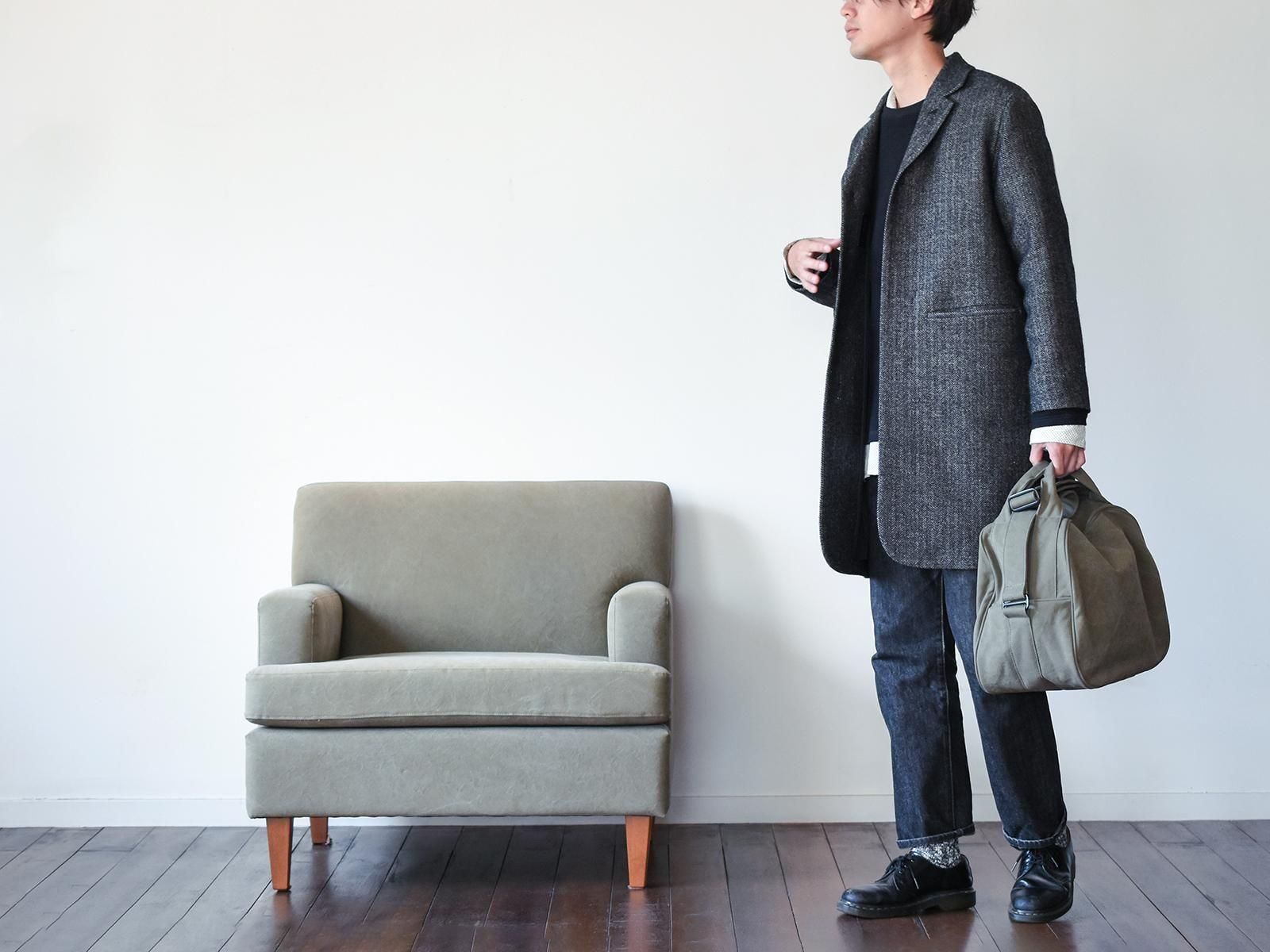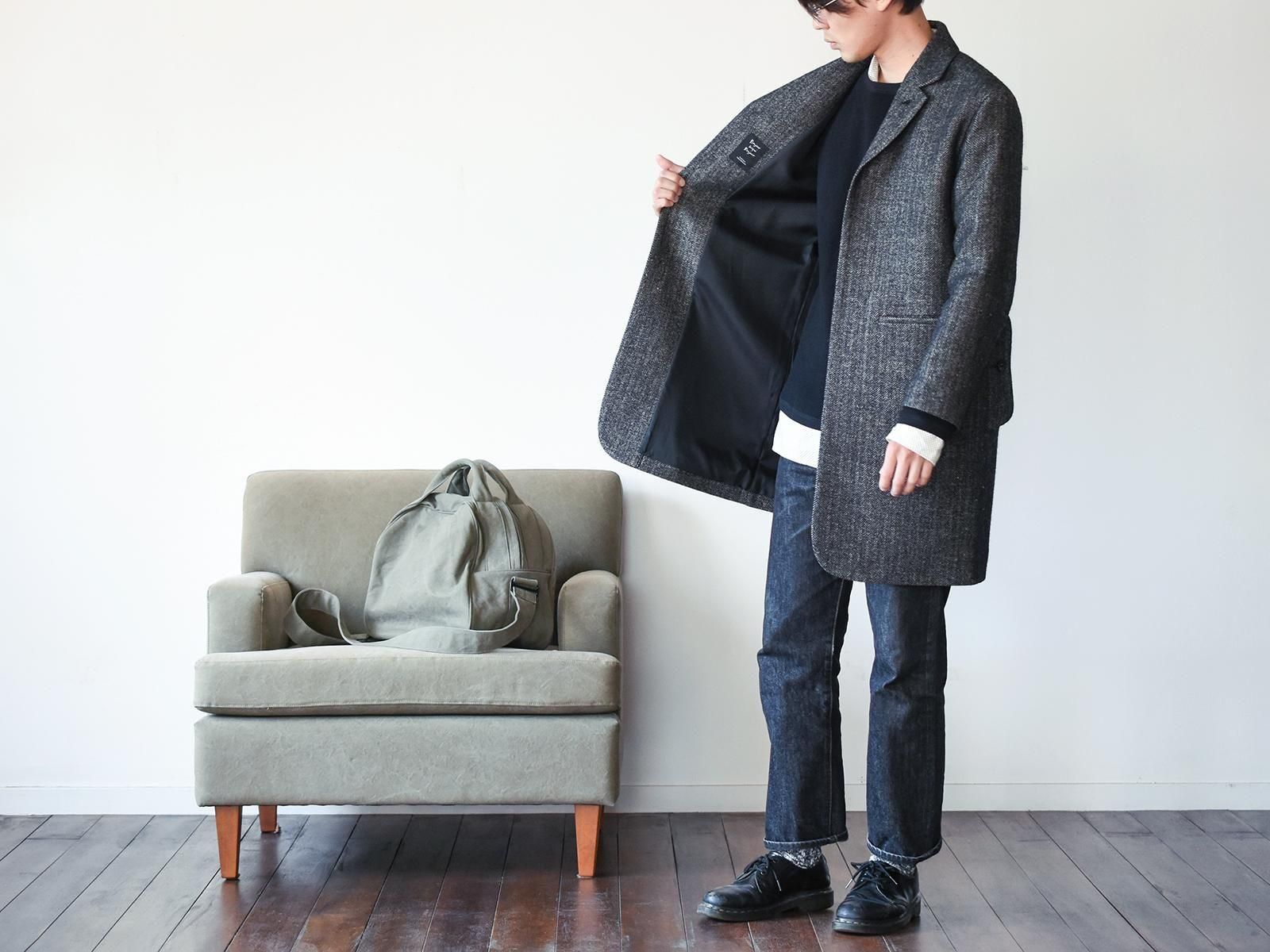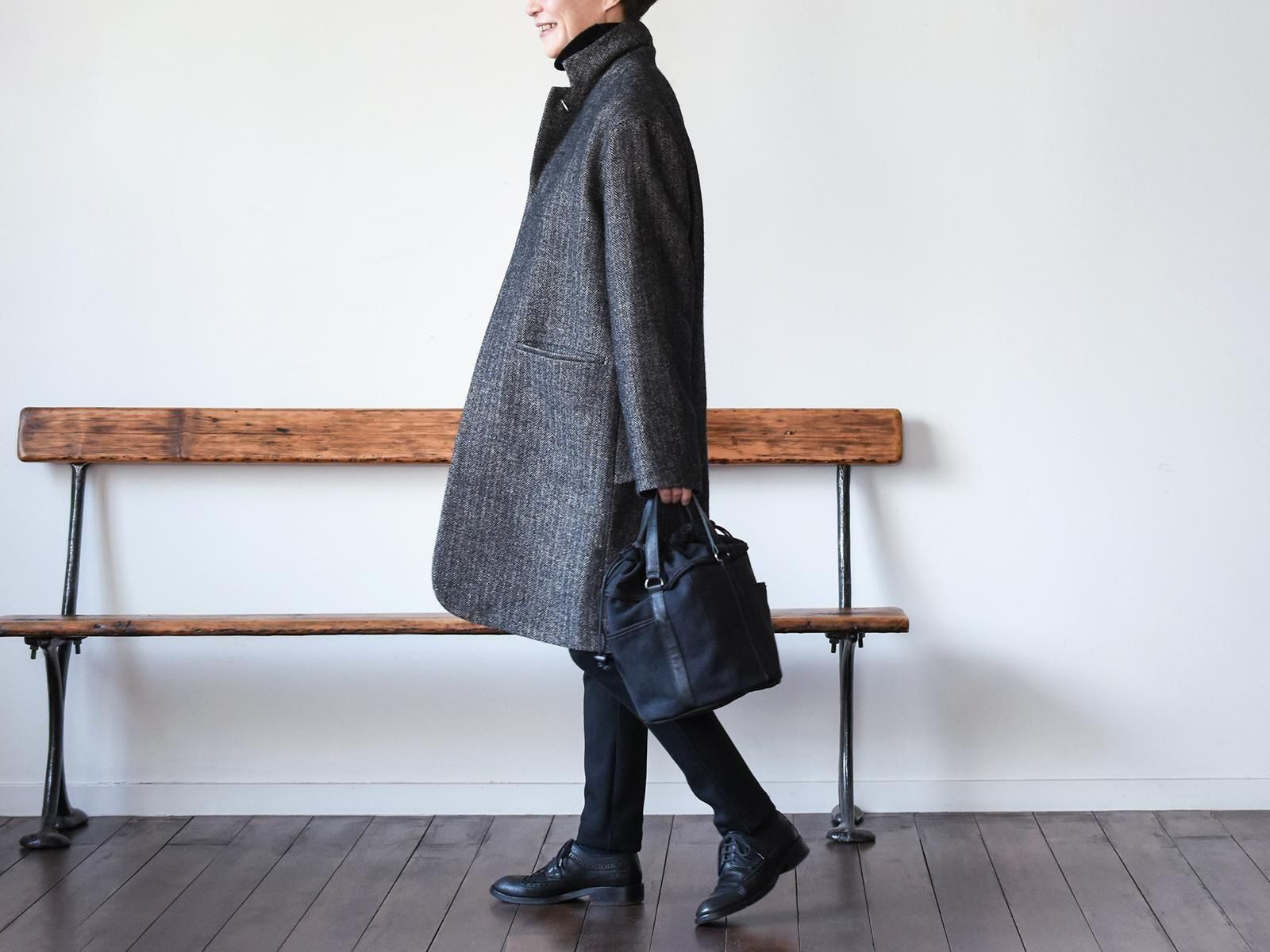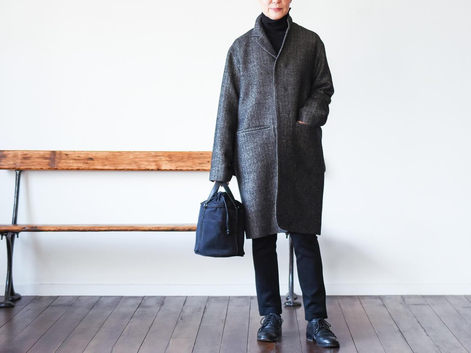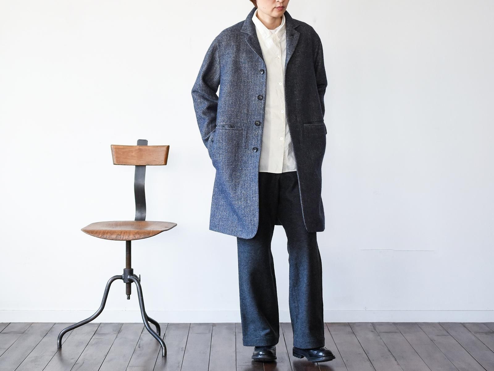 経糸に羊毛を、緯糸にリネンを使用し贅沢に織り上げた上質なヘリンボーン織の国産素材を使用しています。裏地にはフランス製のキュプラガルゼを使用したこだわりの詰まったコートです。小さめのテーラードカラーでメンズライクな中にも女性的でエレガントな要素を加えています。正面に大きめの玉縁ポケット、脇にフラップポケットとWポケット仕様はデザインのアクセントとしても実用としても楽しんでいただけます。センターバックにはスリットが入っています。