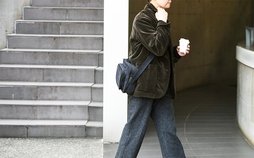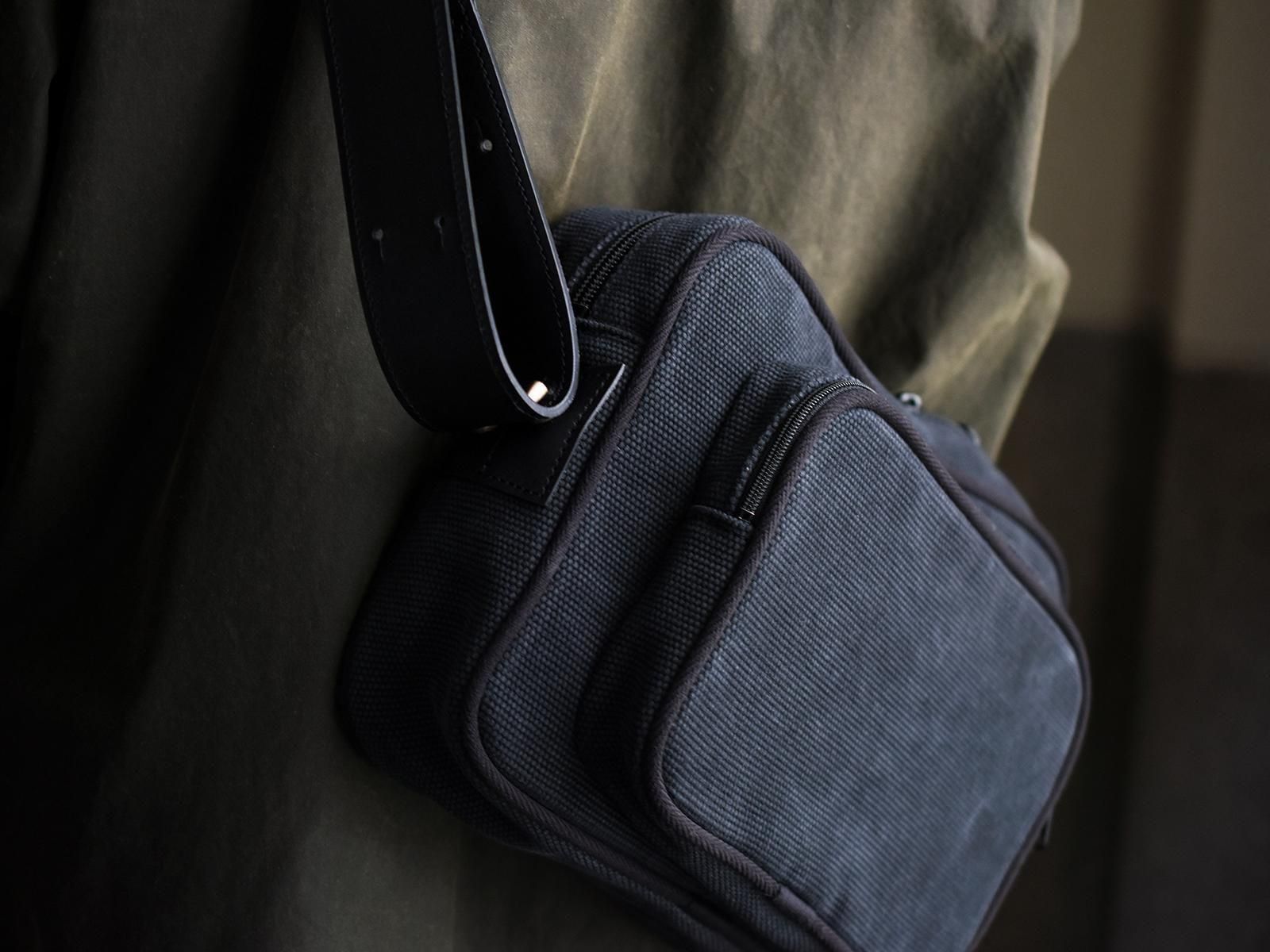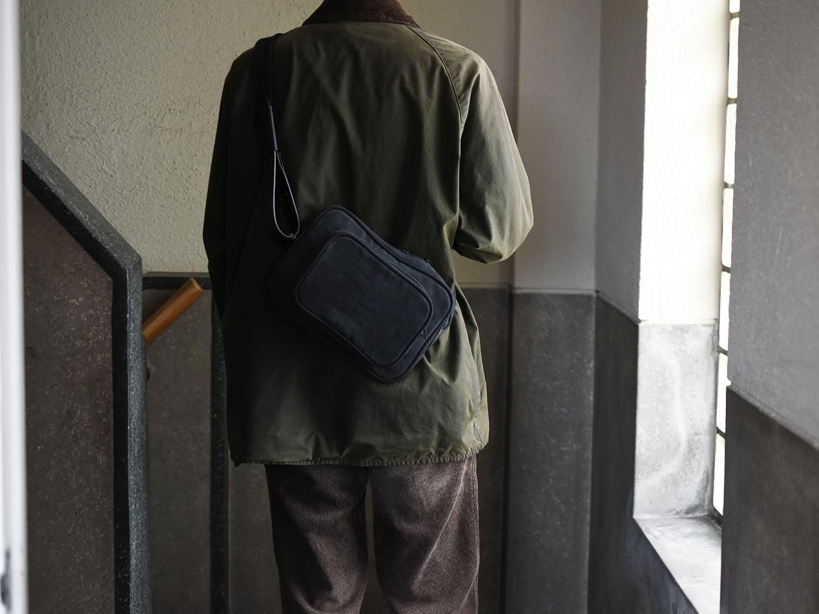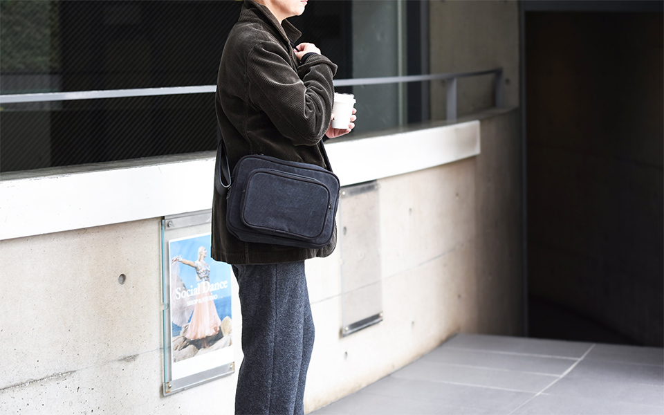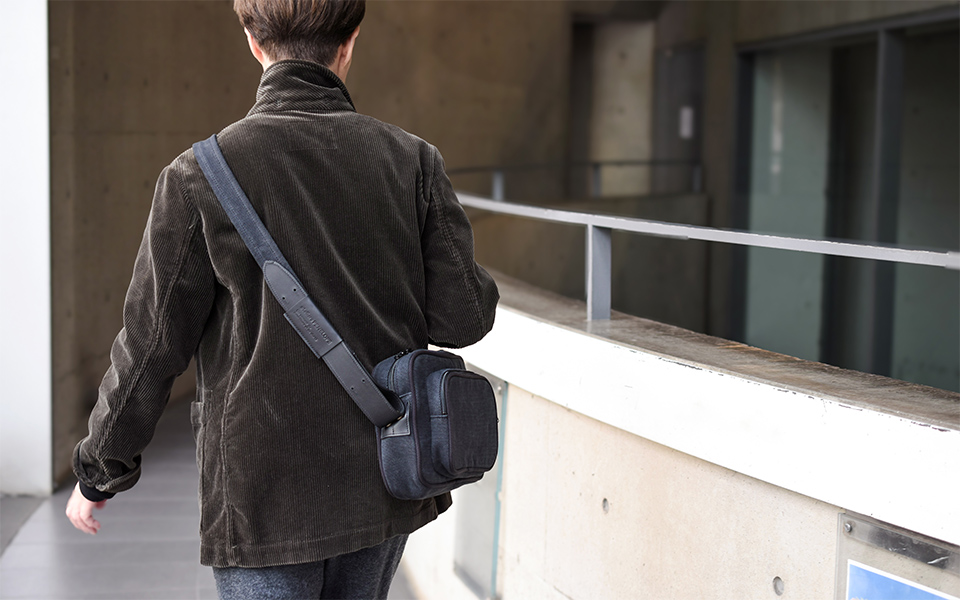 岡山県倉敷で織られたオリジナルオックスフォード織の素材とレザーとのコンビネーションによって重厚感とクラシカルな雰囲気を持ち合わせたショルダーバッグです。ショルダー付け根を斜めに取り付けることでボディのフォルムが立体的に立つよう設計しています。Treppe(トレッペ)とは、ドイツ語でステップ(階段)を表し、立体的な前ポケットとの段差をイメージして付けられました。ショルダーの長さ調節はギボシに固定する作りとなっており、ロゴエンボスの入ったベルト通しが個性的なアクセントとなっています。iPadや手帳の入る日常的なサイズ感です。