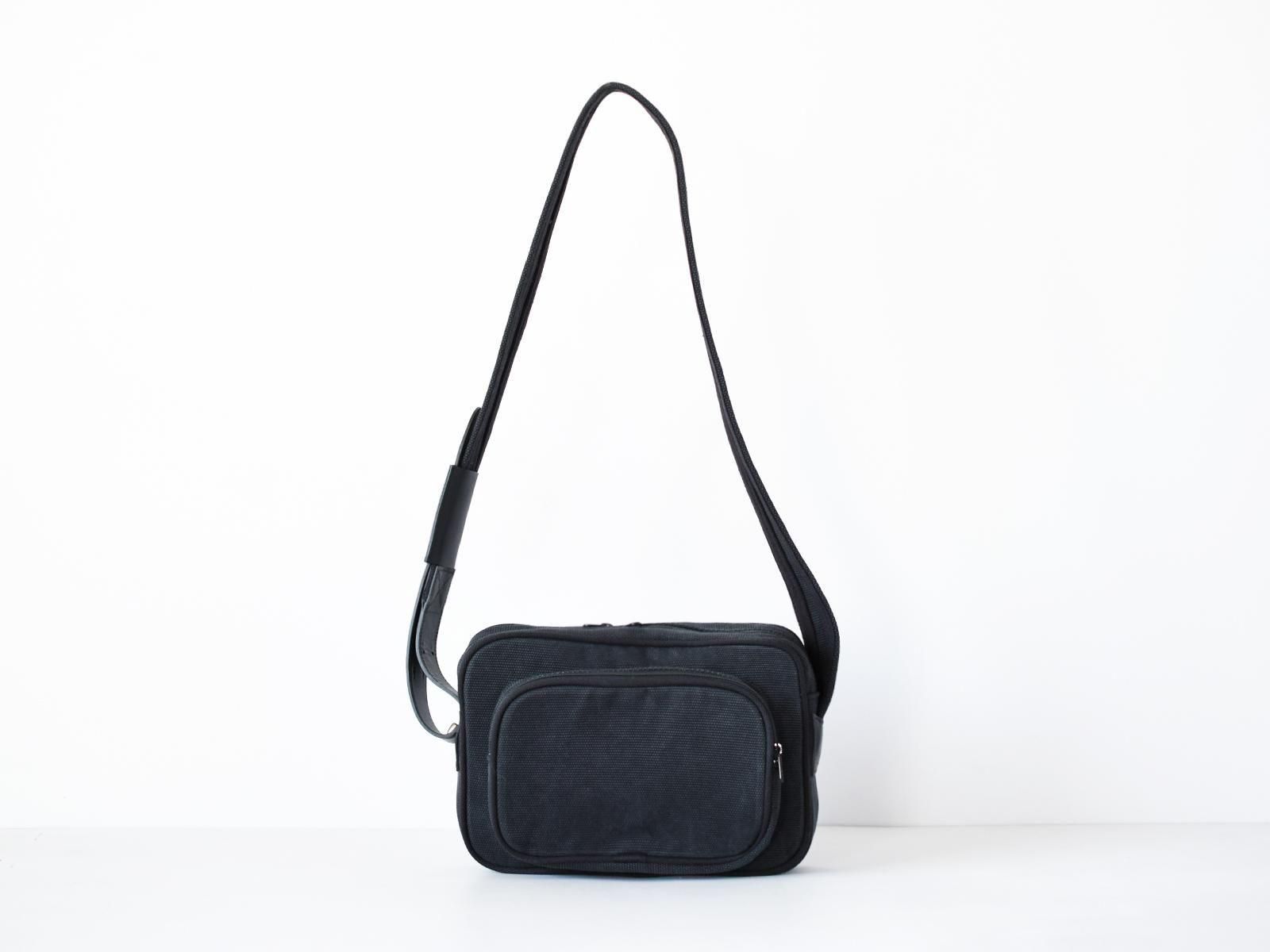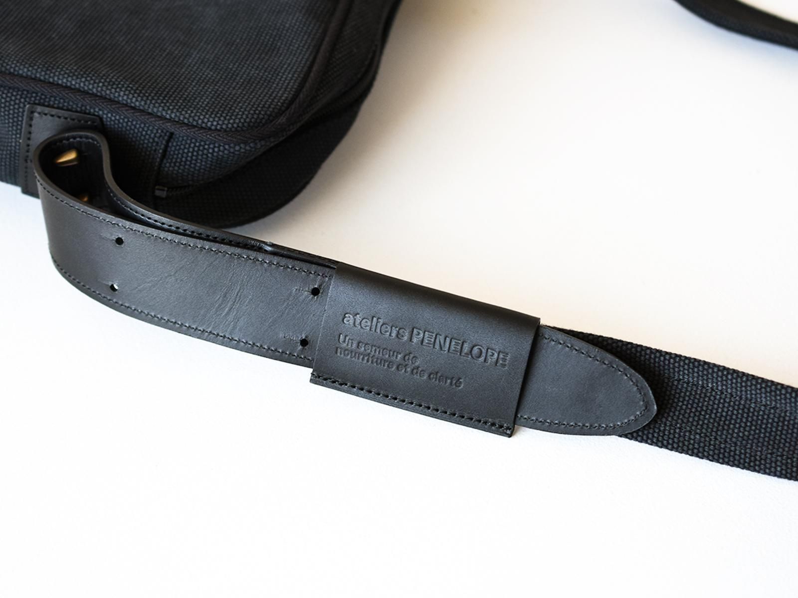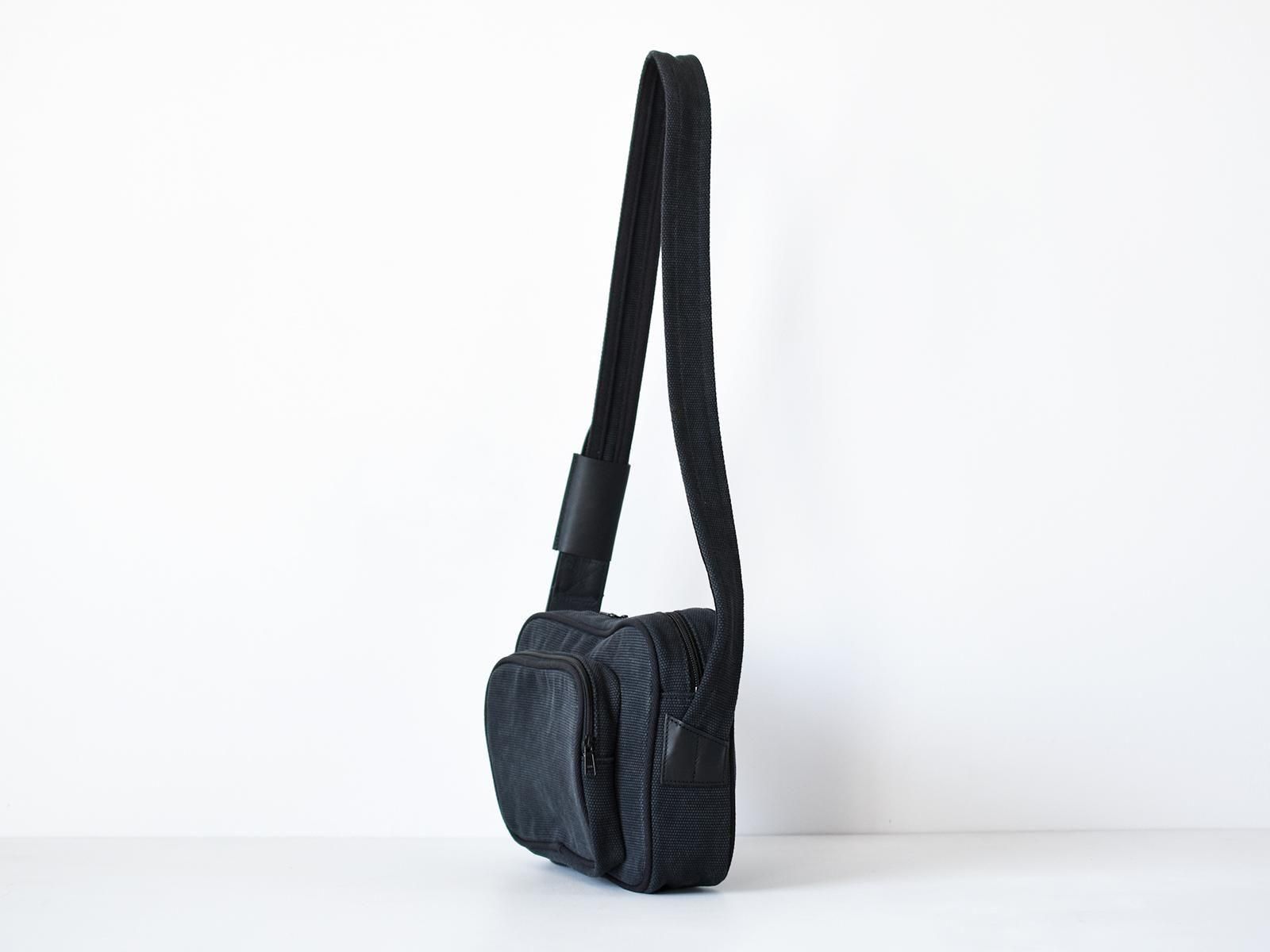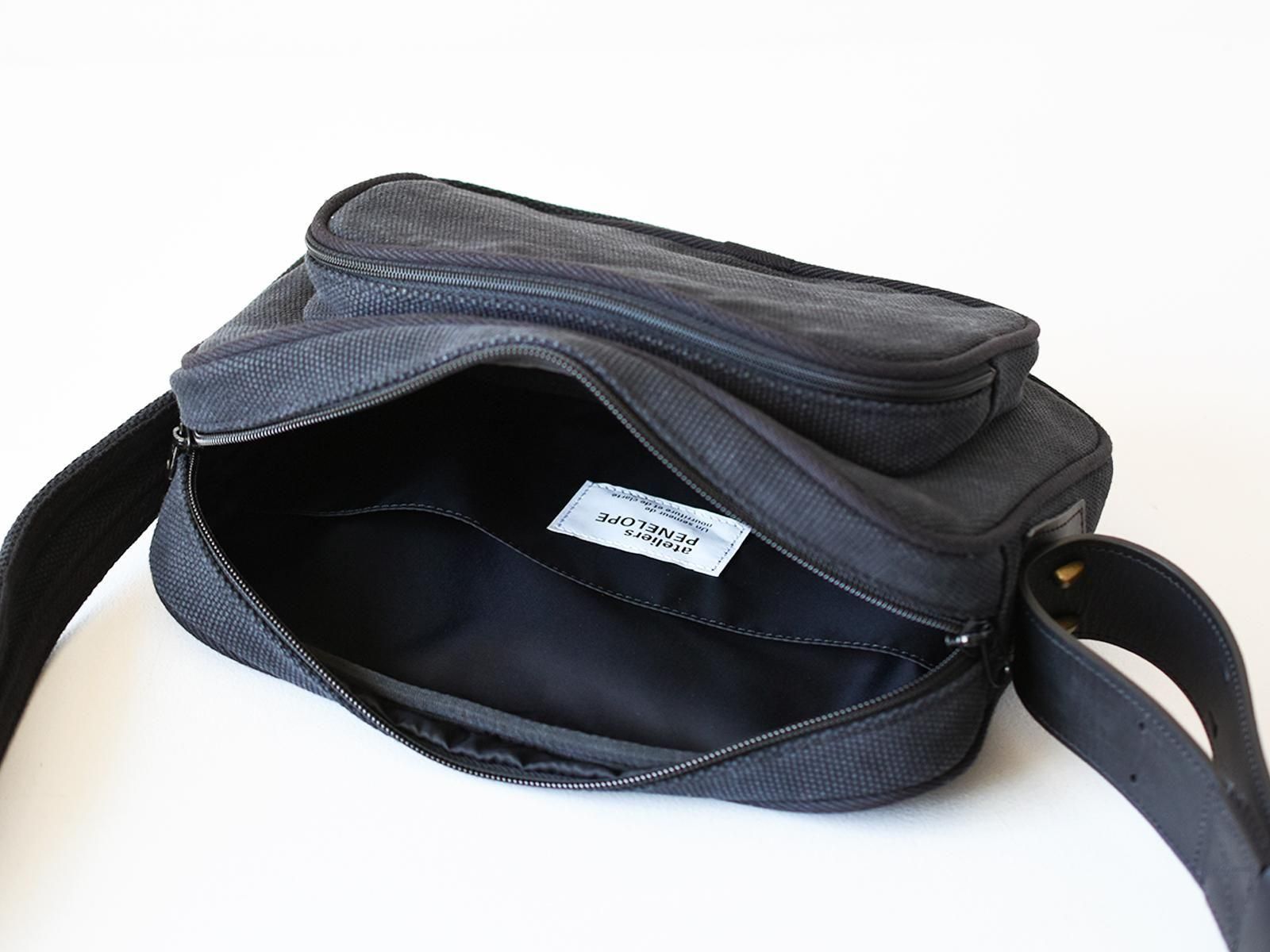 岡山県倉敷で織られたオリジナルオックスフォード織の素材とレザーとのコンビネーションによって重厚感とクラシカルな雰囲気を持ち合わせたショルダーバッグです。ショルダー付け根を斜めに取り付けることでボディのフォルムが立体的に立つよう設計しています。Treppe(トレッペ)とは、ドイツ語でステップ(階段)を表し、立体的な前ポケットとの段差をイメージして付けられました。ショルダーの長さ調節はギボシに固定する作りとなっており、ロゴエンボスの入ったベルト通しが個性的なアクセントとなっています。iPadや手帳の入る日常的なサイズ感です。