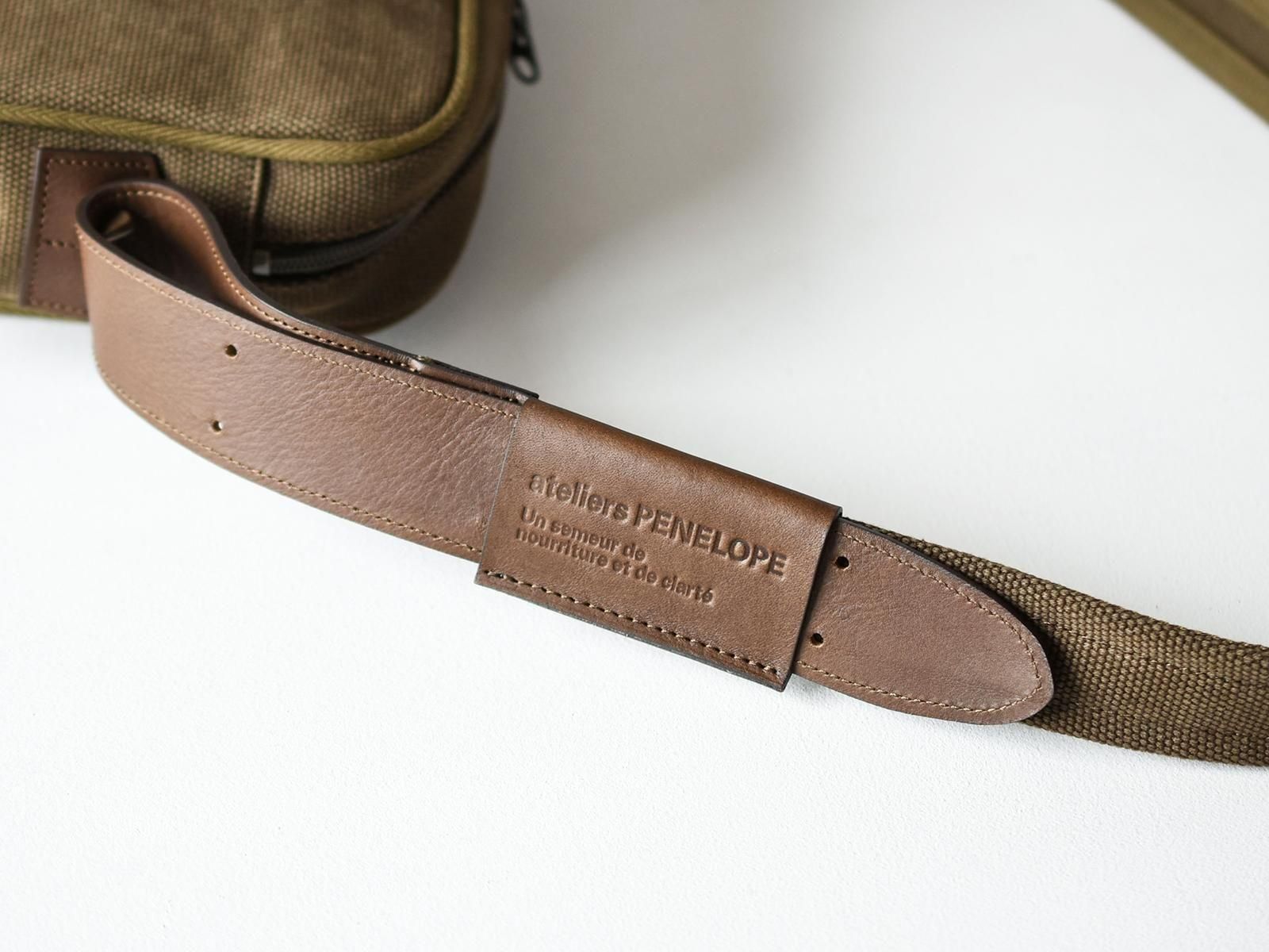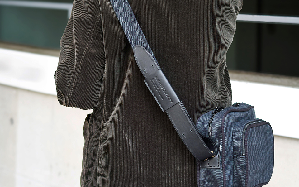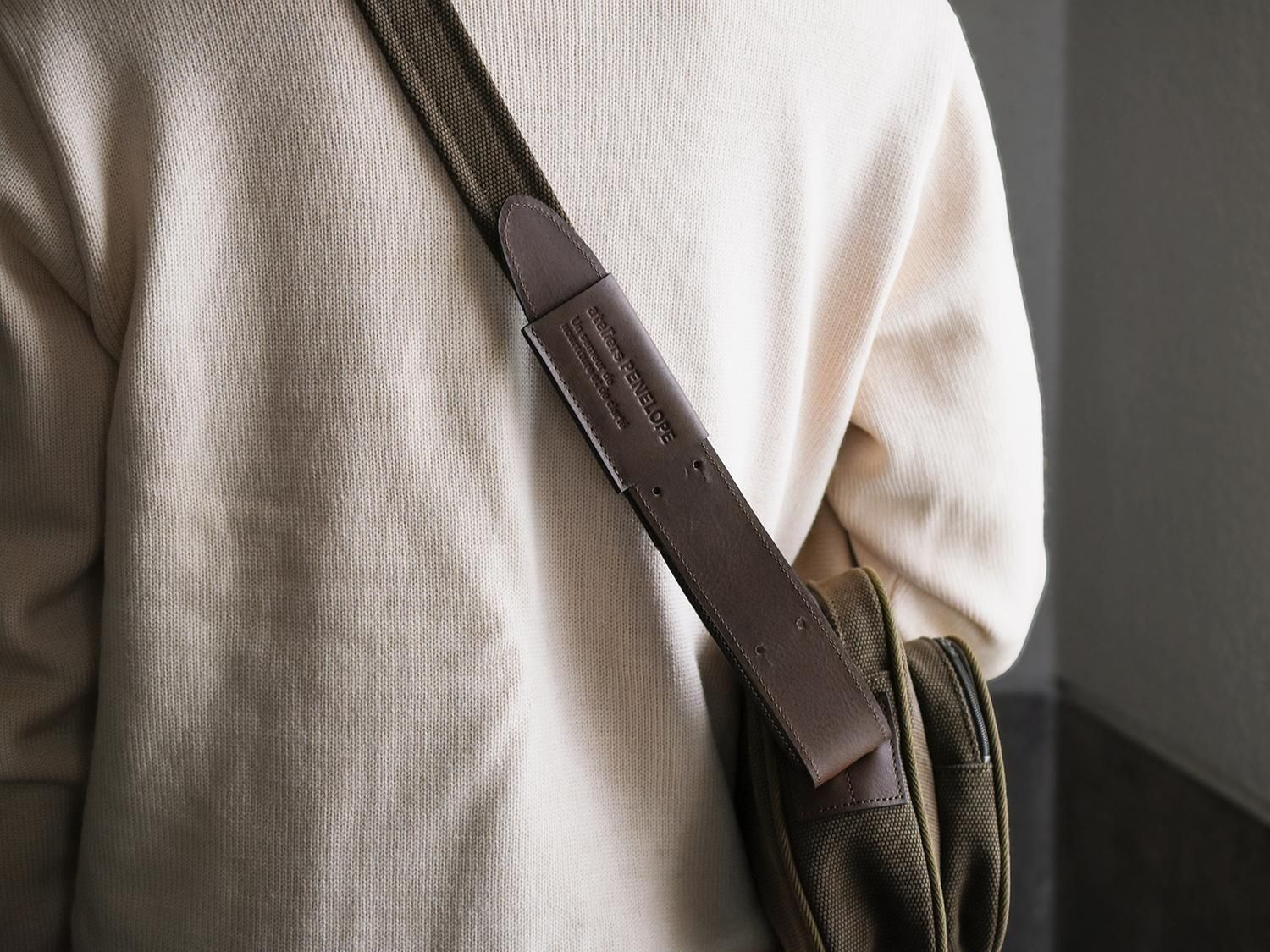 ショルダーの長さはクチバシギボシ(金具)で5段階に調節が可能です。ショルダーの先端を折り返してロゴ素押し入りのレザーベルトループで固定することができます。