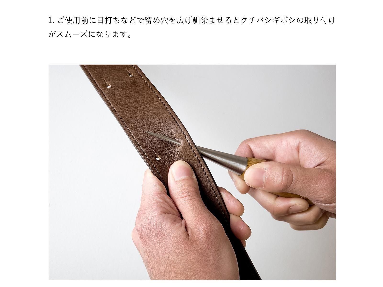 1. ご使用前に目打ちなどで留め穴を広げ馴染ませるとクチバシギボシの取り付けがスムーズになります。