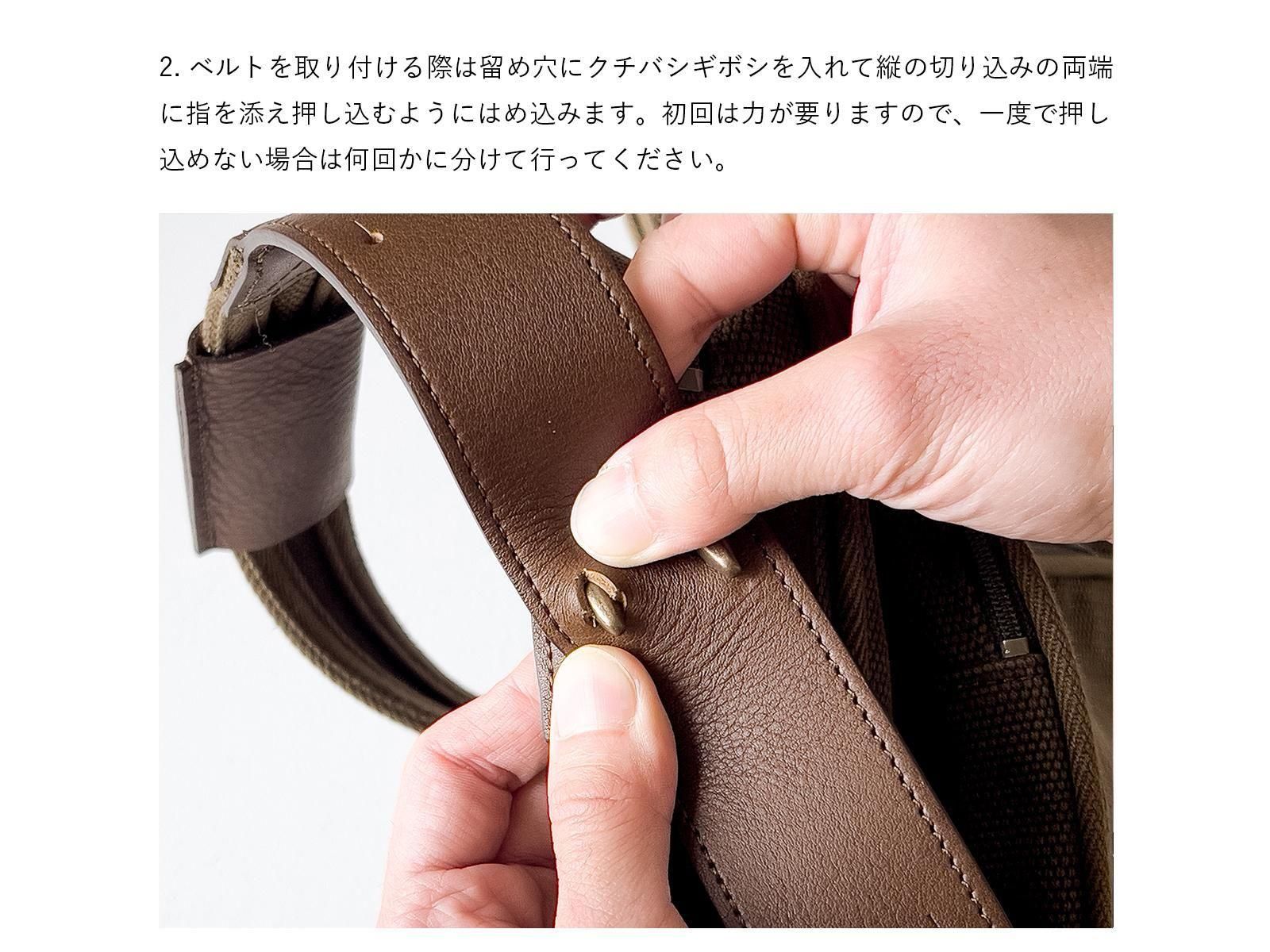 2. ベルトを取り付ける際は留め穴にクチバシギボシを入れて縦の切り込みの両端に指を添え押し込むようにはめ込みます。初回は力が要りますので、一度で押し込めない場合は何回かに分けて行ってください。