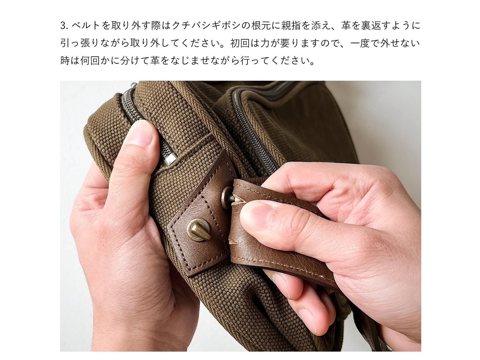 ショルダーの長さはクチバシギボシ(金具)の留め位置を変えることで5段階に調節が出来ます。使い始めは留め穴の革が非常に硬く、取り付け・取り外しに力が要りますが、ご使用いただくうちに革が馴染み着脱し易くなります。