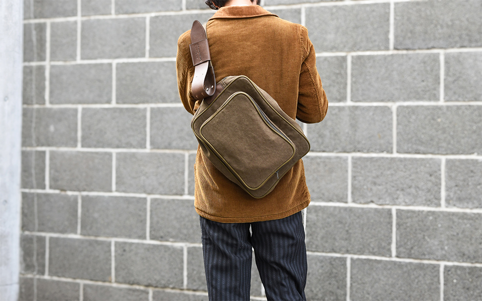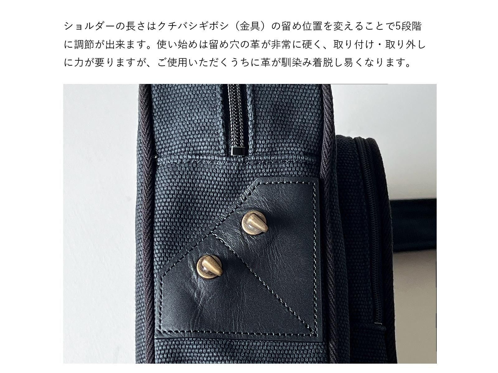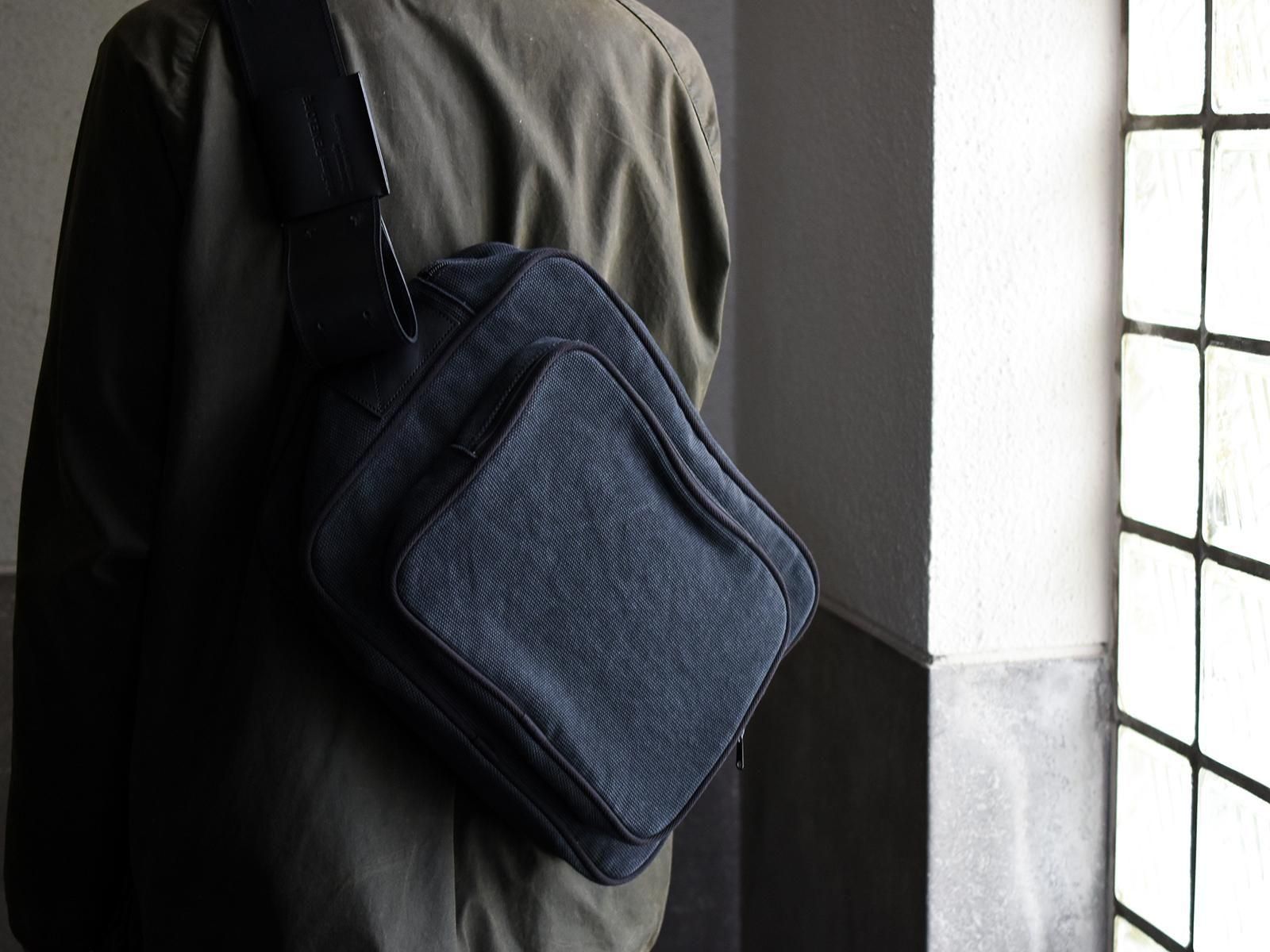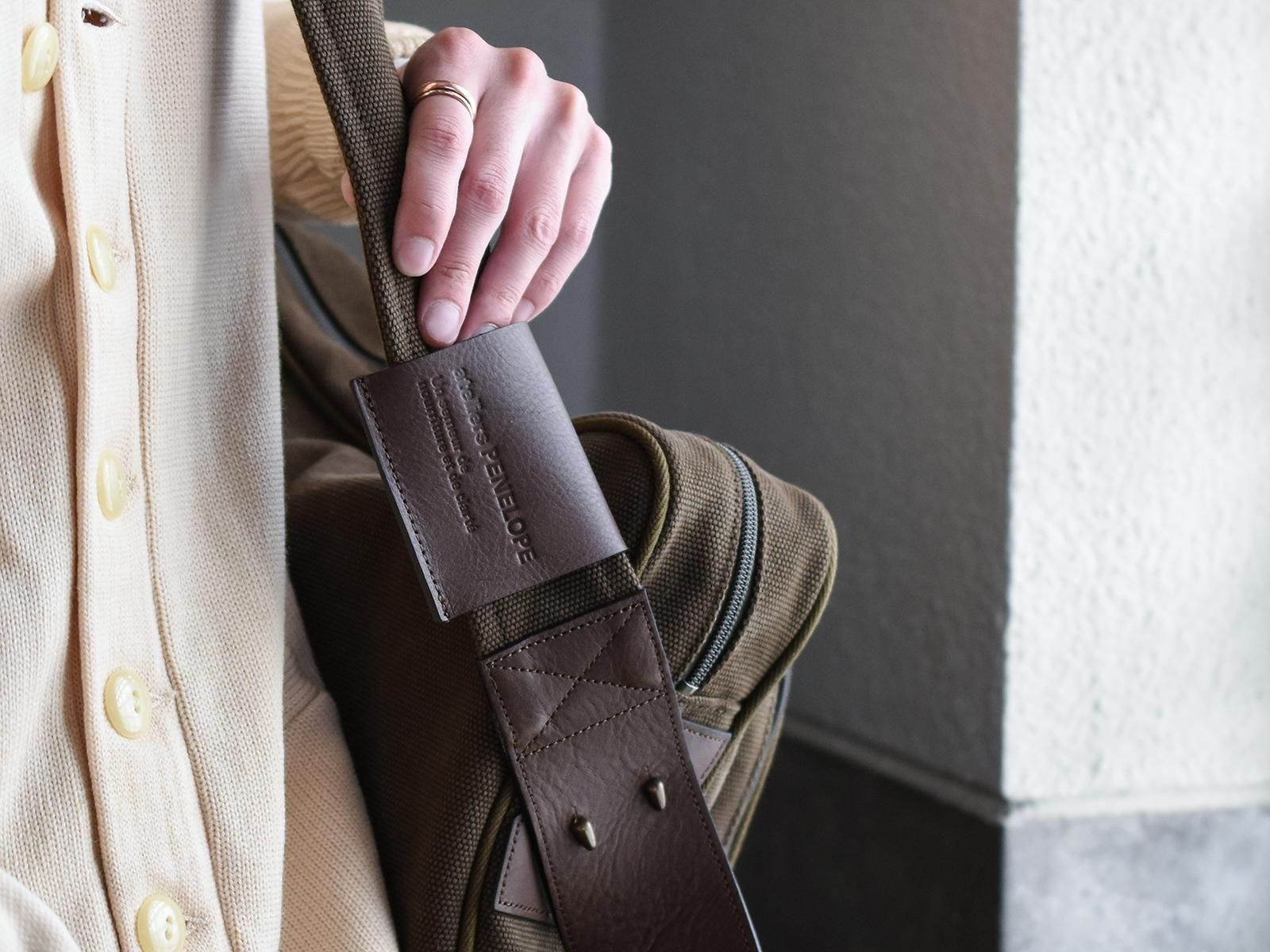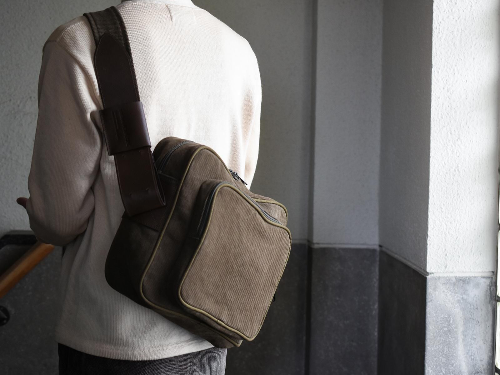 岡山県倉敷で織られたオリジナルオックスフォード織の素材とレザーとのコンビネーションによって重厚感とクラシカルな雰囲気を持ち合わせたショルダーバッグです。ショルダー付け根を斜めに取り付けることでボディのフォルムが立体的に立つよう設計しています。Treppe(トレッペ)とは、ドイツ語でステップ(階段)を表し、立体的な前ポケットとの段差をイメージして付けられました。ショルダーの長さ調節はギボシに固定する作りとなっており、ロゴエンボスの入ったベルト通しが個性的なアクセントとなっています。ラップトップPCやA4書類も入る便利なサイズ感です。