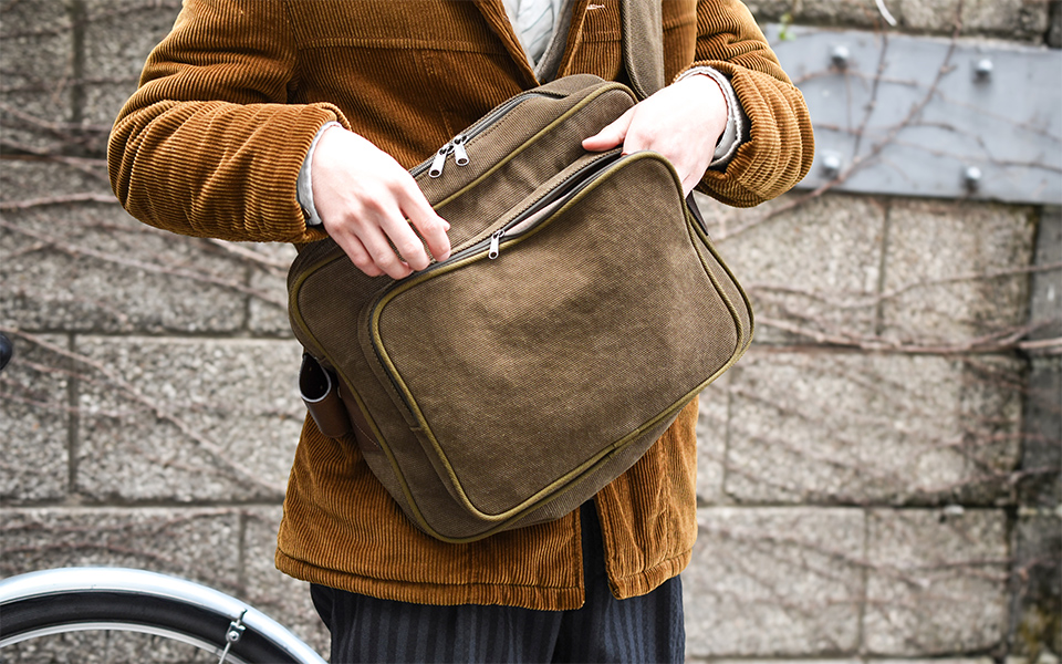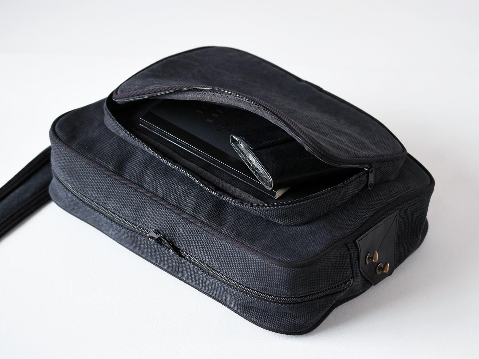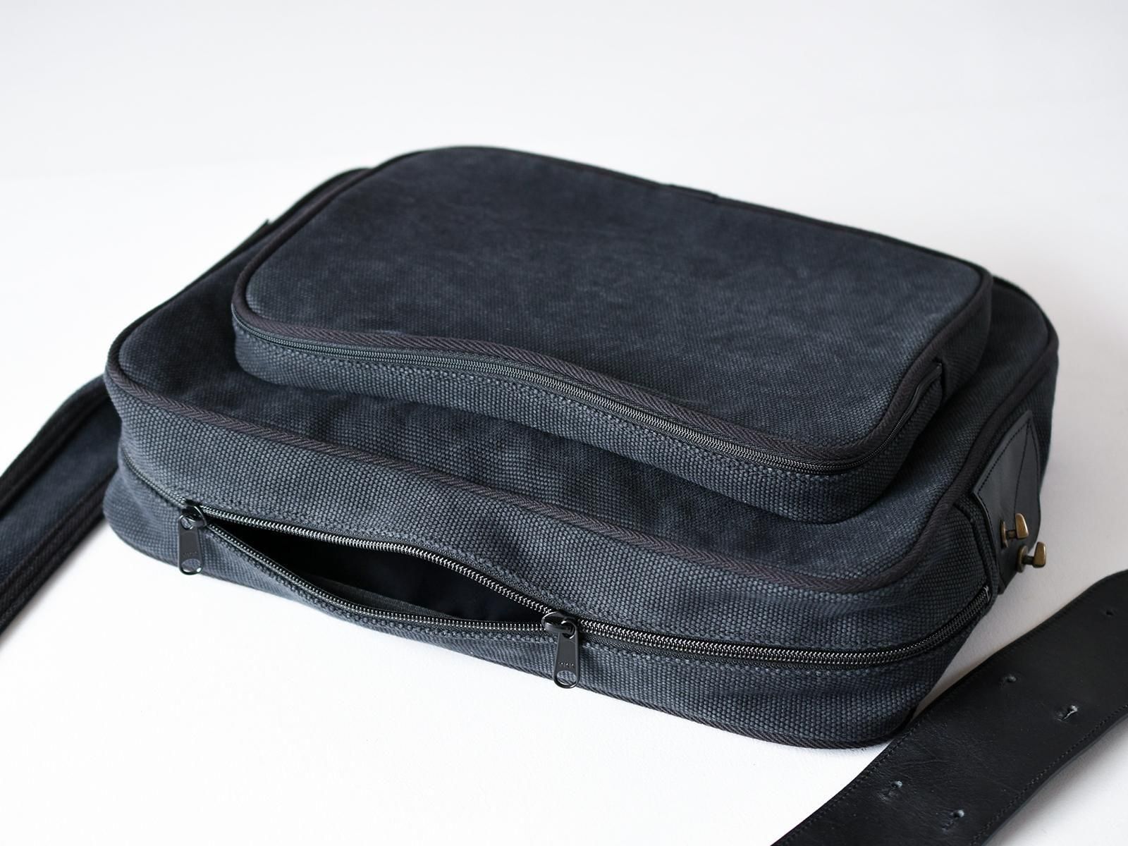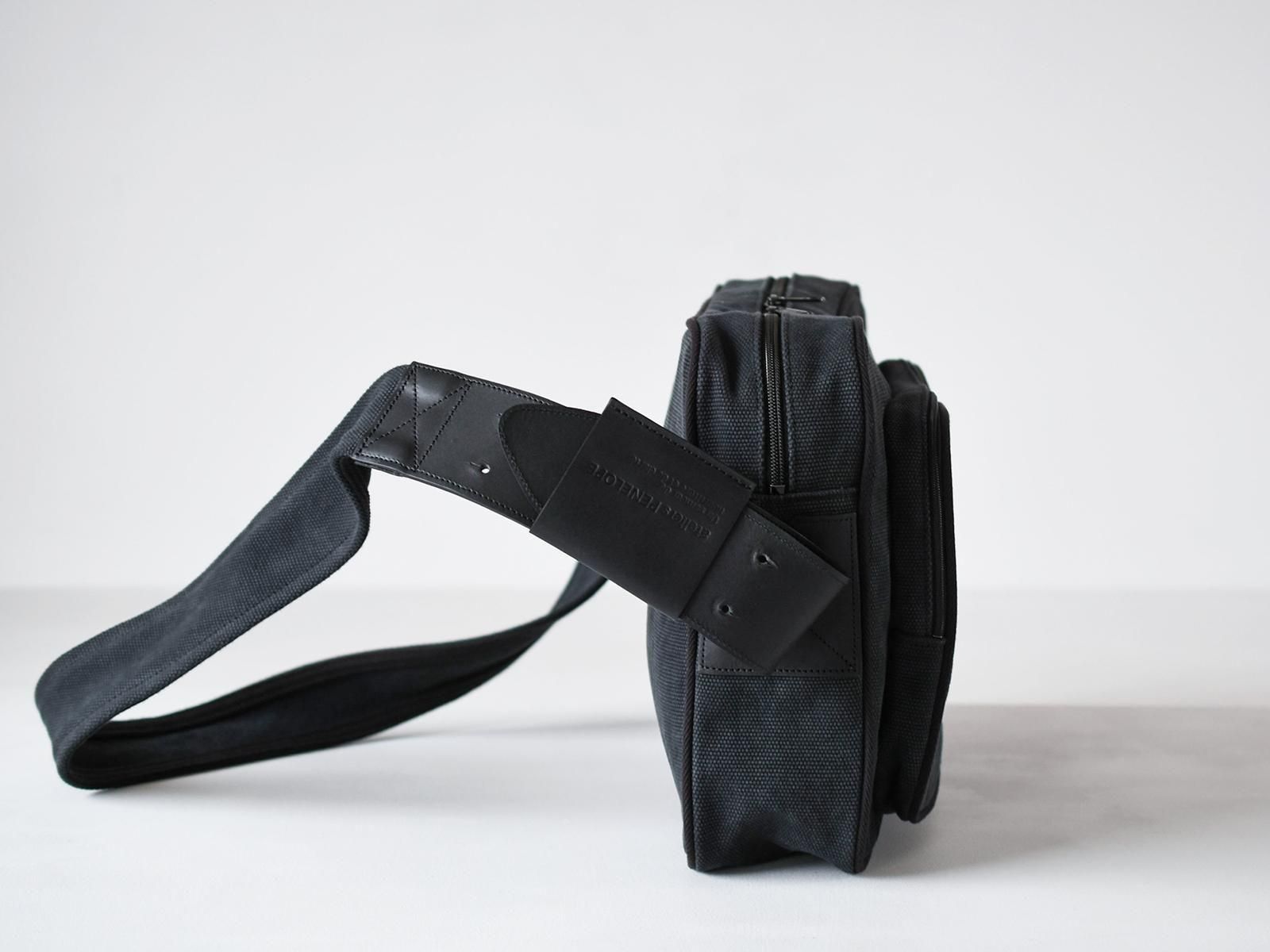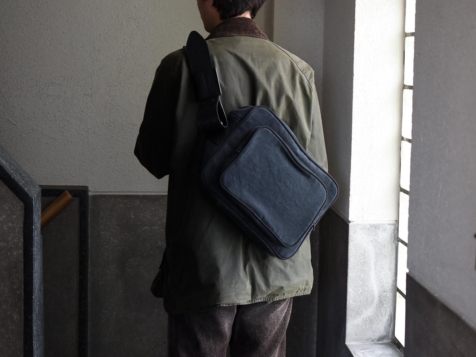 岡山県倉敷で織られたオリジナルオックスフォード織の素材とレザーとのコンビネーションによって重厚感とクラシカルな雰囲気を持ち合わせたショルダーバッグです。ショルダー付け根を斜めに取り付けることでボディのフォルムが立体的に立つよう設計しています。Treppe(トレッペ)とは、ドイツ語でステップ(階段)を表し、立体的な前ポケットとの段差をイメージして付けられました。ショルダーの長さ調節はギボシに固定する作りとなっており、ロゴエンボスの入ったベルト通しが個性的なアクセントとなっています。ラップトップPCやA4書類も入る便利なサイズ感です。