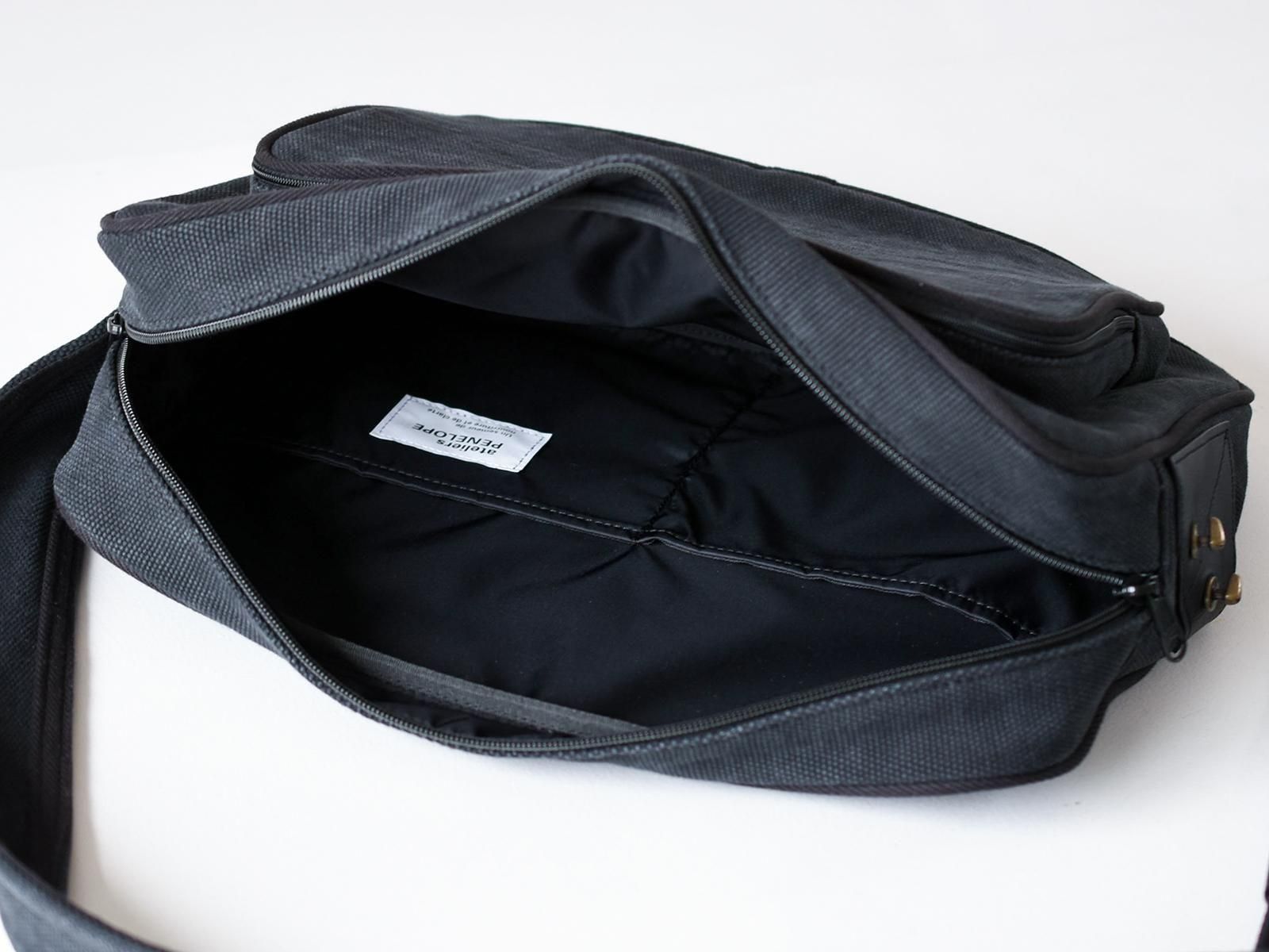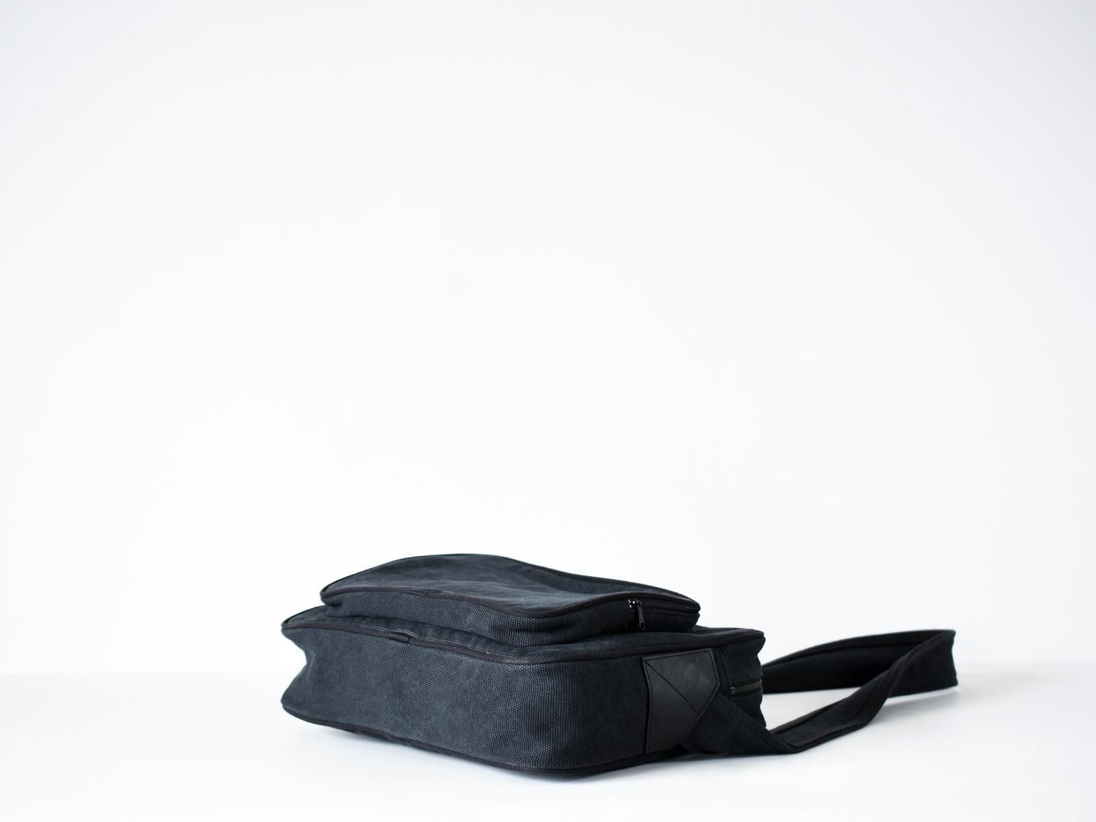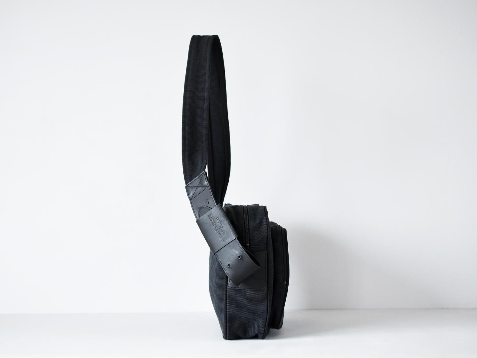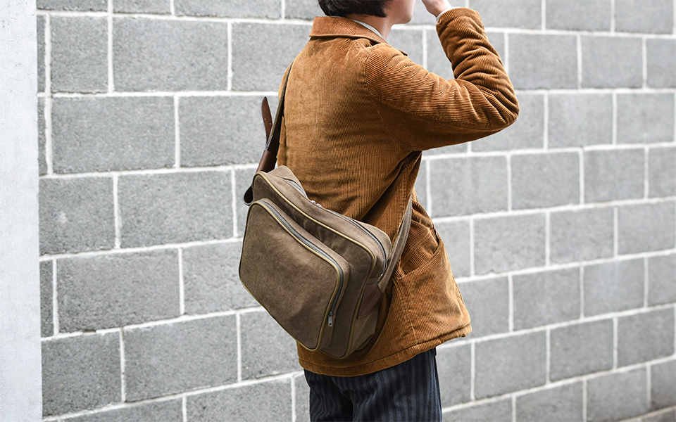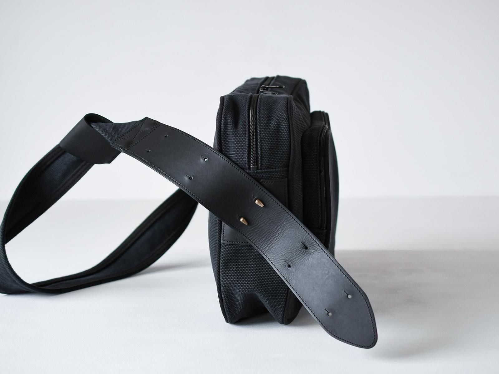 岡山県倉敷で織られたオリジナルオックスフォード織の素材とレザーとのコンビネーションによって重厚感とクラシカルな雰囲気を持ち合わせたショルダーバッグです。ショルダー付け根を斜めに取り付けることでボディのフォルムが立体的に立つよう設計しています。Treppe(トレッペ)とは、ドイツ語でステップ(階段)を表し、立体的な前ポケットとの段差をイメージして付けられました。ショルダーの長さ調節はギボシに固定する作りとなっており、ロゴエンボスの入ったベルト通しが個性的なアクセントとなっています。ラップトップPCやA4書類も入る便利なサイズ感です。