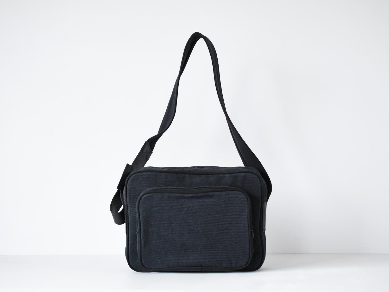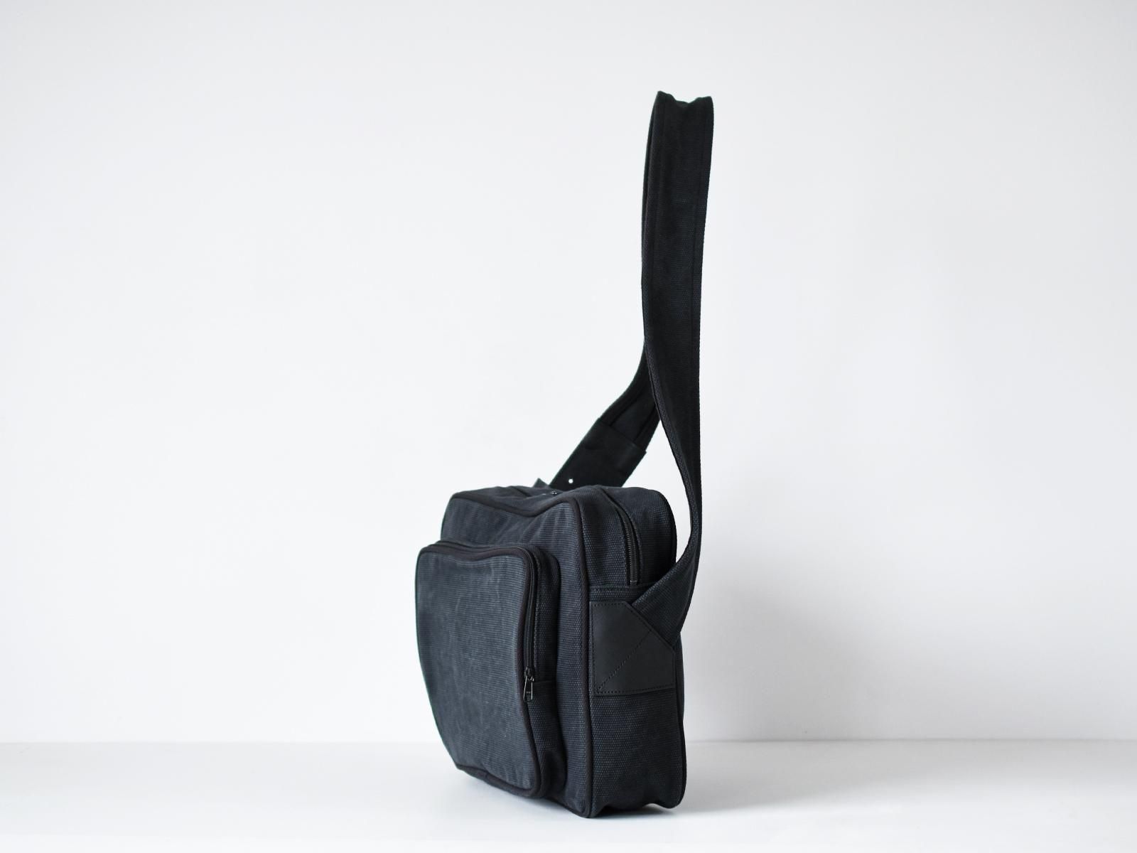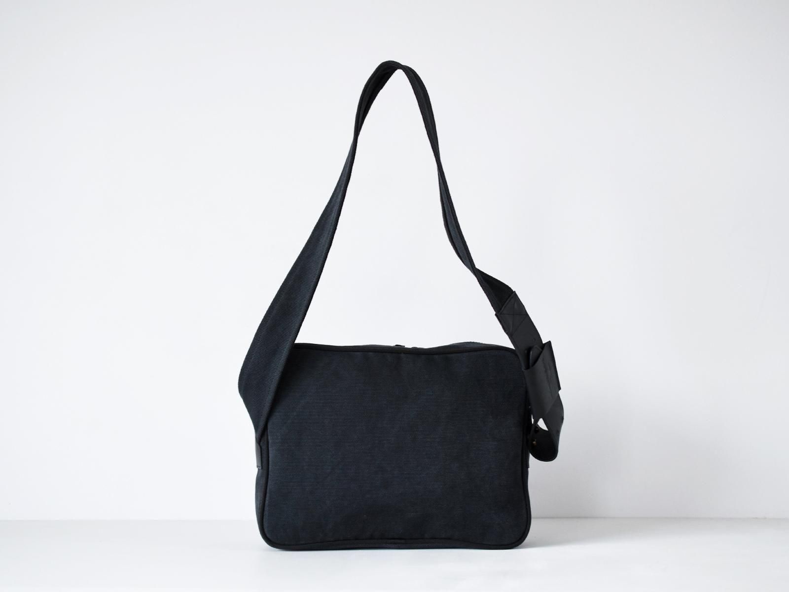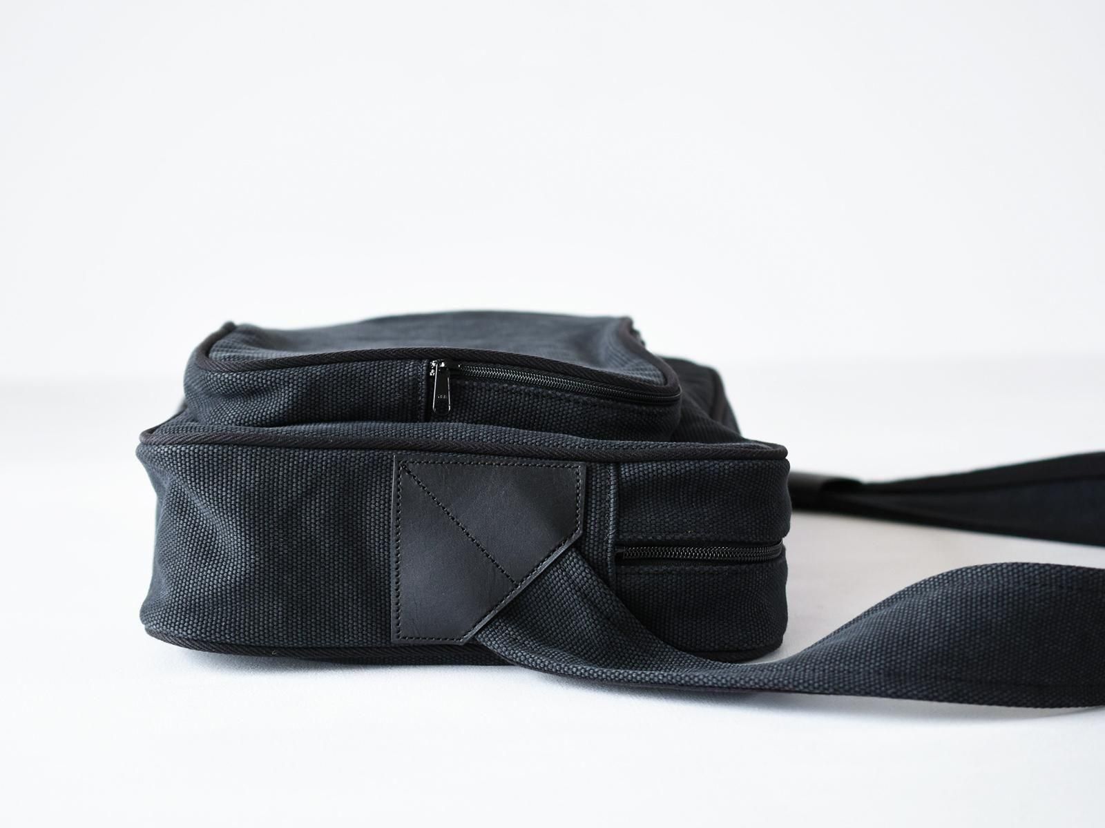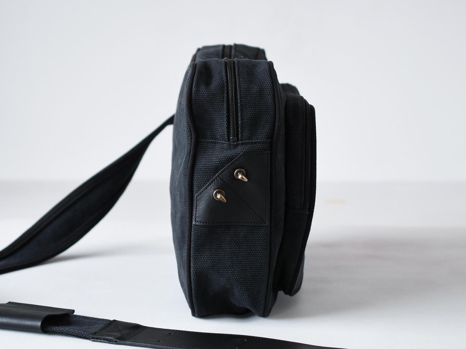 岡山県倉敷で織られたオリジナルオックスフォード織の素材とレザーとのコンビネーションによって重厚感とクラシカルな雰囲気を持ち合わせたショルダーバッグです。ショルダー付け根を斜めに取り付けることでボディのフォルムが立体的に立つよう設計しています。Treppe(トレッペ)とは、ドイツ語でステップ(階段)を表し、立体的な前ポケットとの段差をイメージして付けられました。ショルダーの長さ調節はギボシに固定する作りとなっており、ロゴエンボスの入ったベルト通しが個性的なアクセントとなっています。ラップトップPCやA4書類も入る便利なサイズ感です。