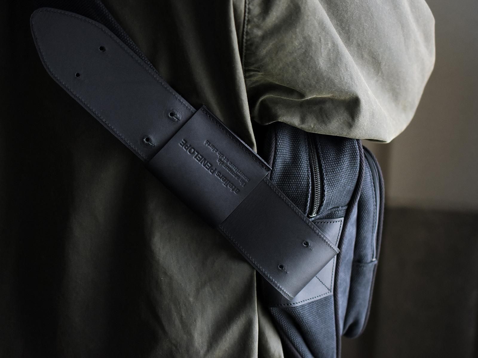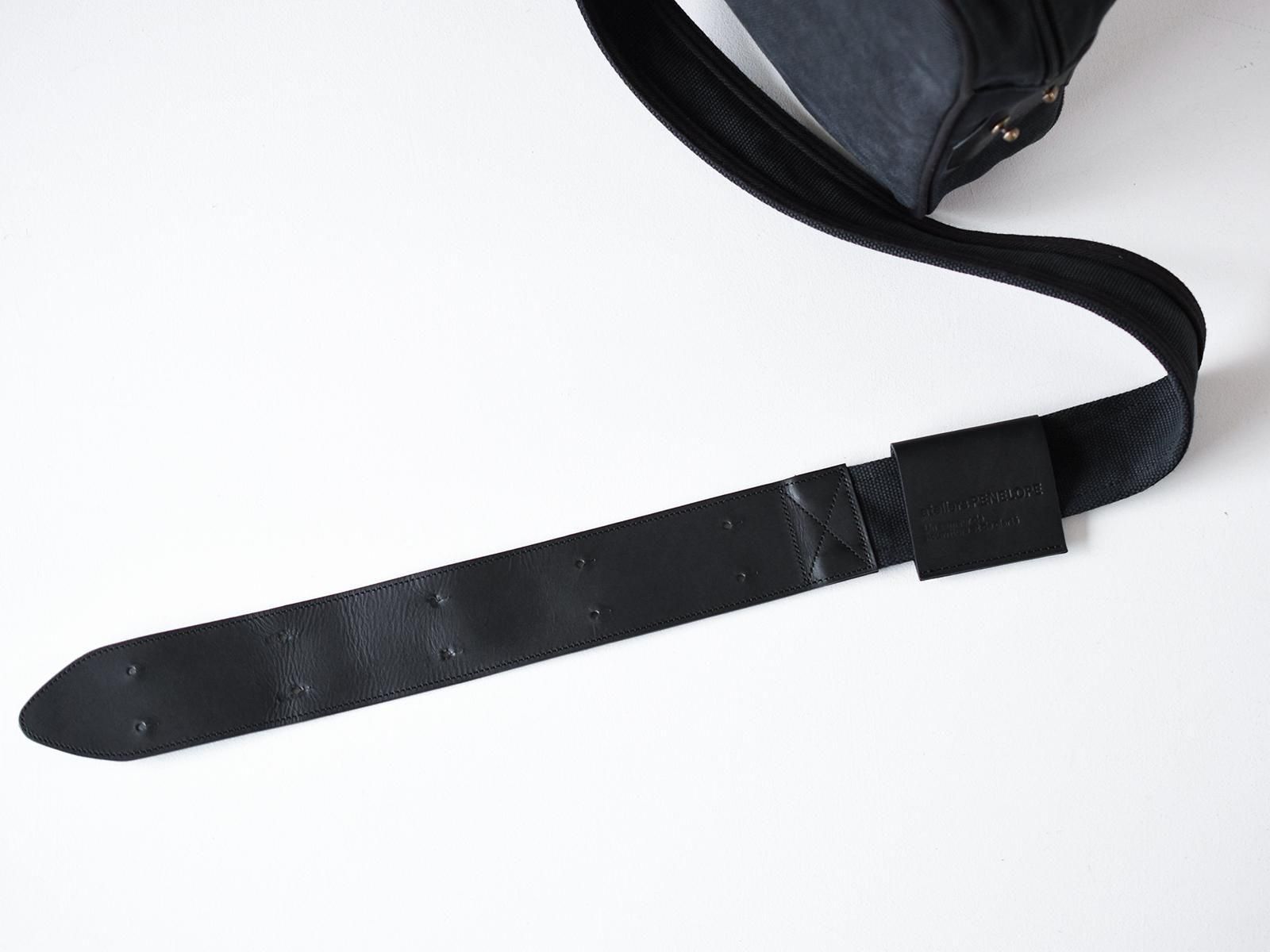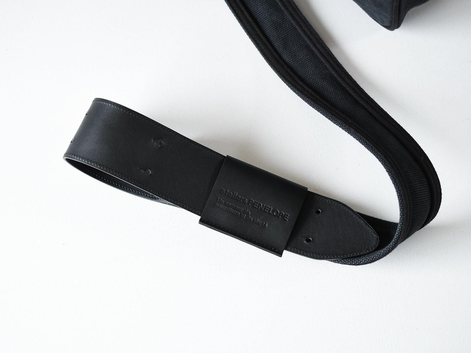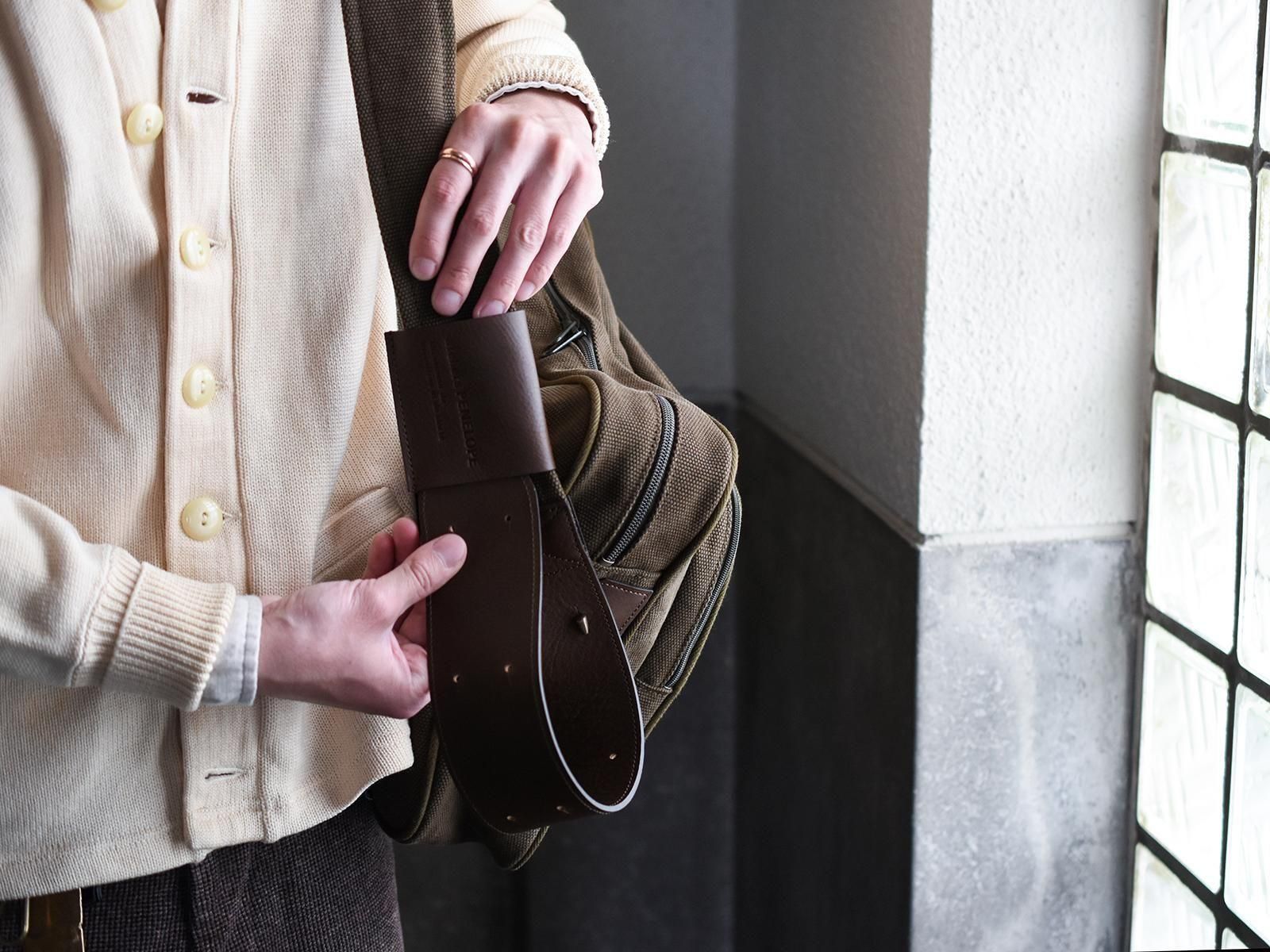ショルダーの長さはクチバシギボシ(金具)で5段階に調節が可能です。ショルダーの先端を折り返してロゴ素押し入りのレザーベルトループで固定することができます。