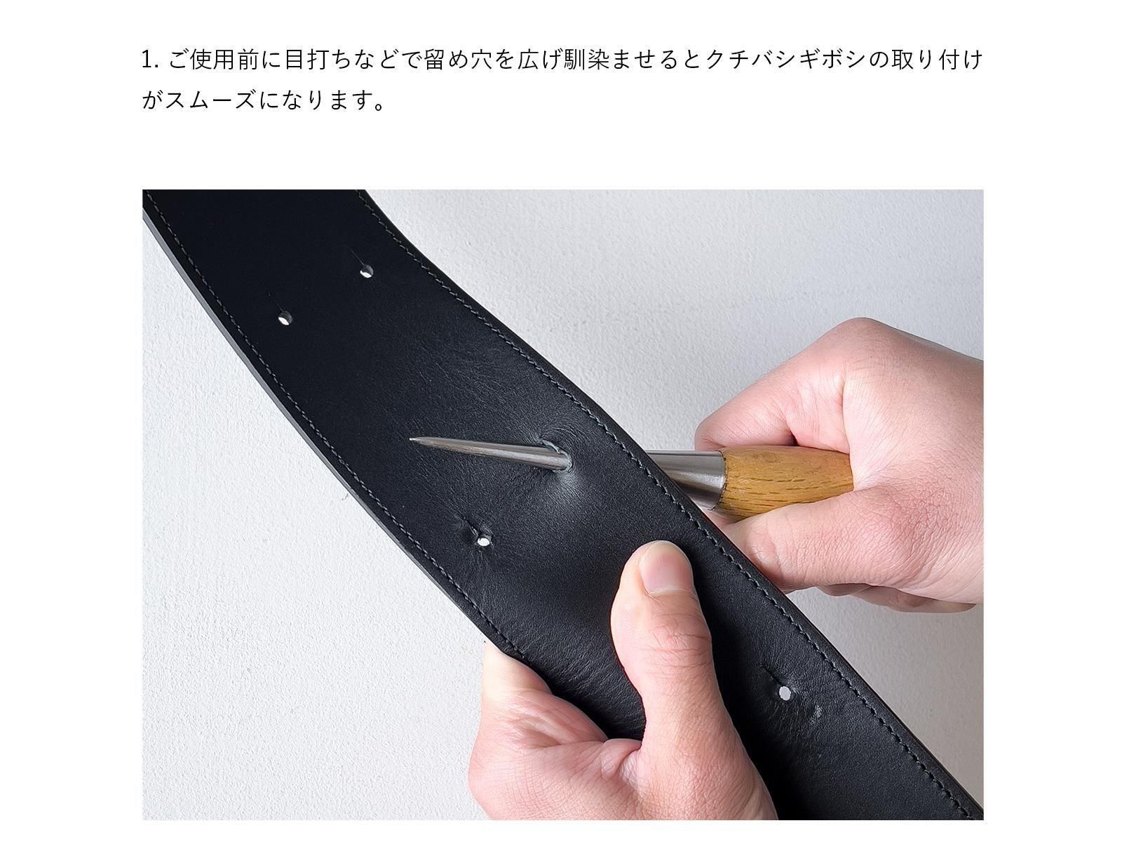 1. ご使用前に目打ちなどで留め穴を広げ馴染ませるとクチバシギボシの取り付けがスムーズになります。