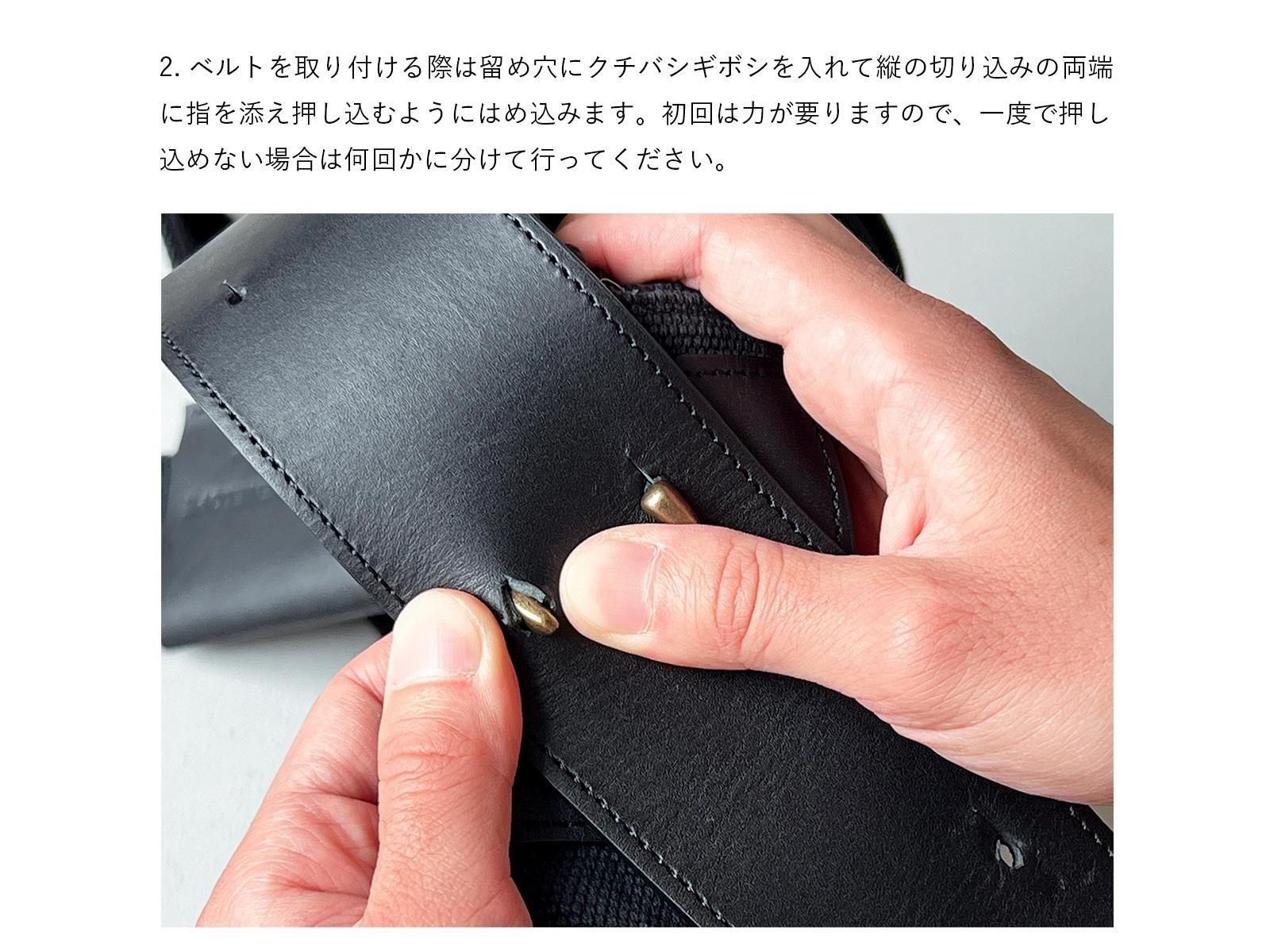 2. ベルトを取り付ける際は留め穴にクチバシギボシを入れて縦の切り込みの両端に指を添え押し込むようにはめ込みます。初回は力が要りますので、一度で押し込めない場合は何回かに分けて行ってください。