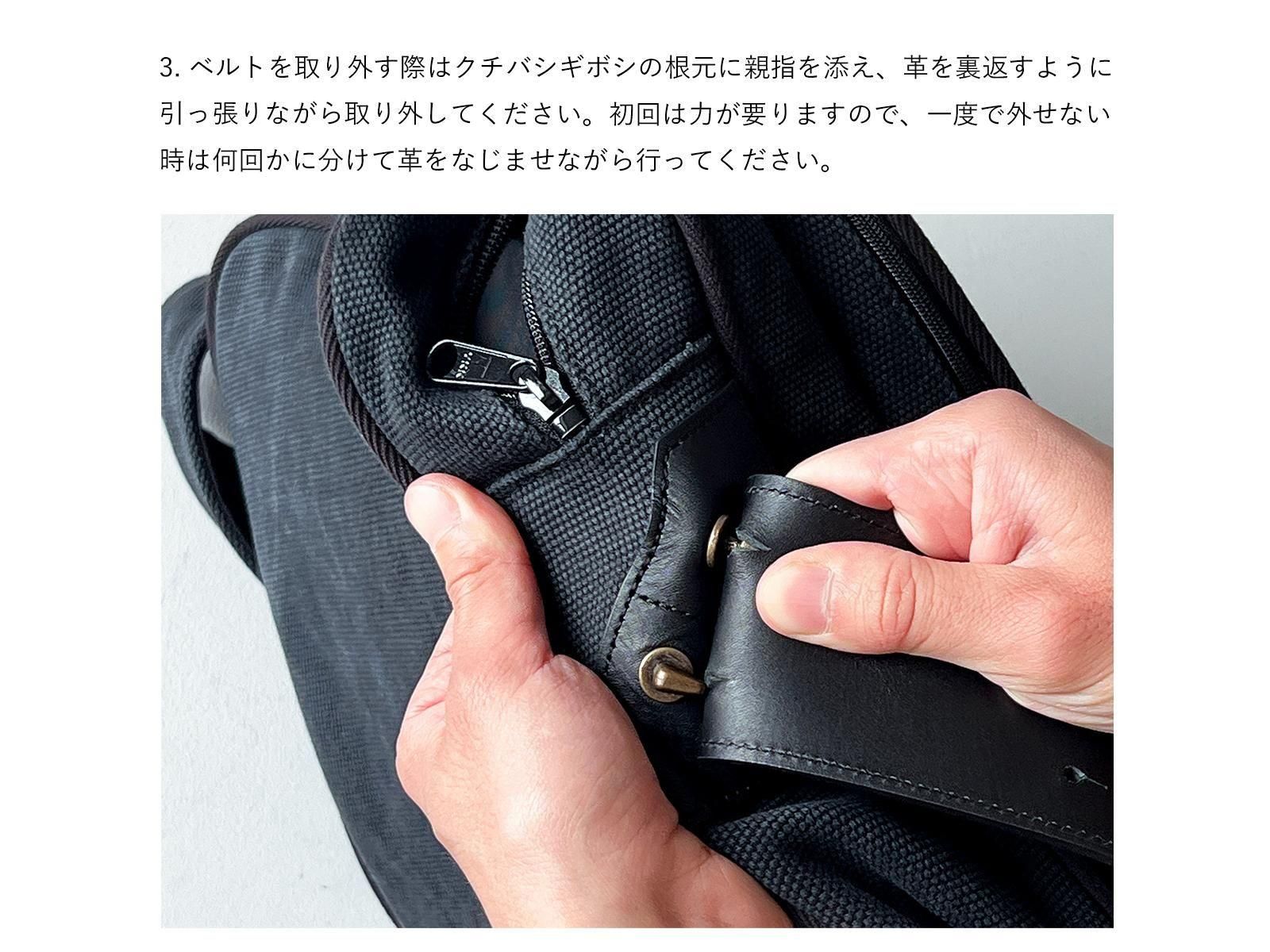 3. ベルトを取り外す際はクチバシギボシの根元に親指を添え、革を裏返すように引っ張りながら取り外してください。初回は力が要りますので、一度で外せない時は何回かに分けて革をなじませながら行ってください。