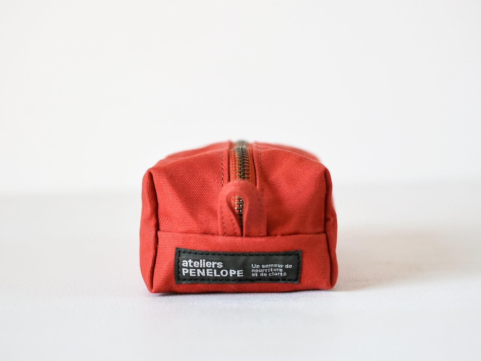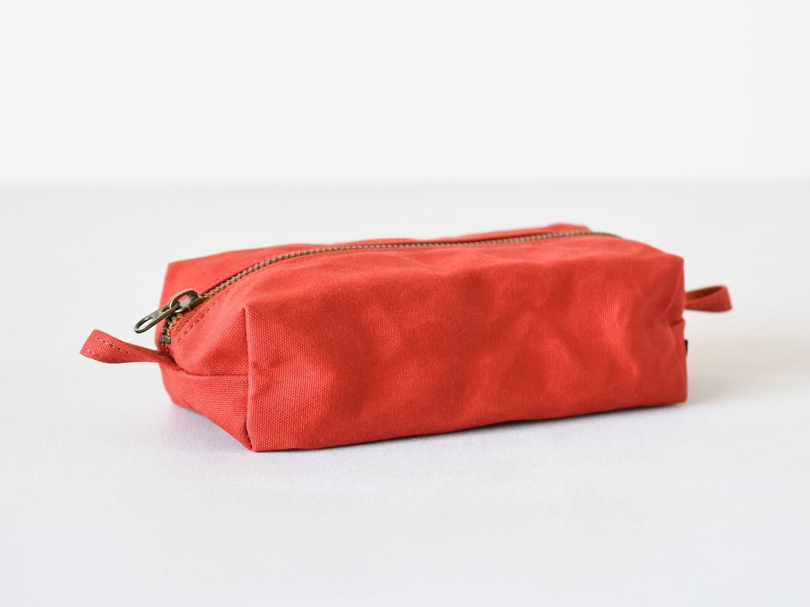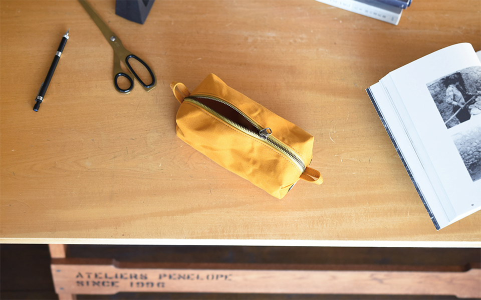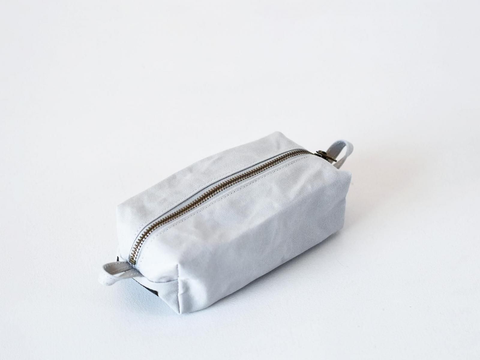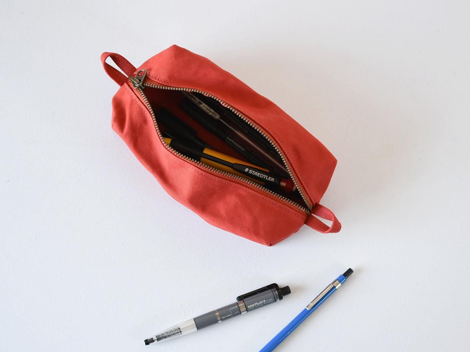 10号帆布を使用した小物の整理に便利なポーチです。紙風船のような立体的なフォルムはステーショナリー、コスメ、ガジェット類の収納に適したサイズ感です。小さなループがついているのでフックなどに吊るすことができます。持ち運びはもちろん、デスク上の収納としてもおすすめです。